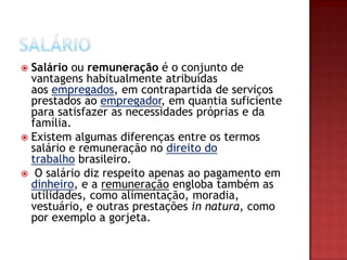 O documento discute os conceitos de salário e remuneração no direito trabalhista brasileiro, incluindo como são calculados, pagos e protegidos legalmente. Também lista diversos tipos de adicionais salariais como horas extras, adicional noturno e benefícios como salário-família.