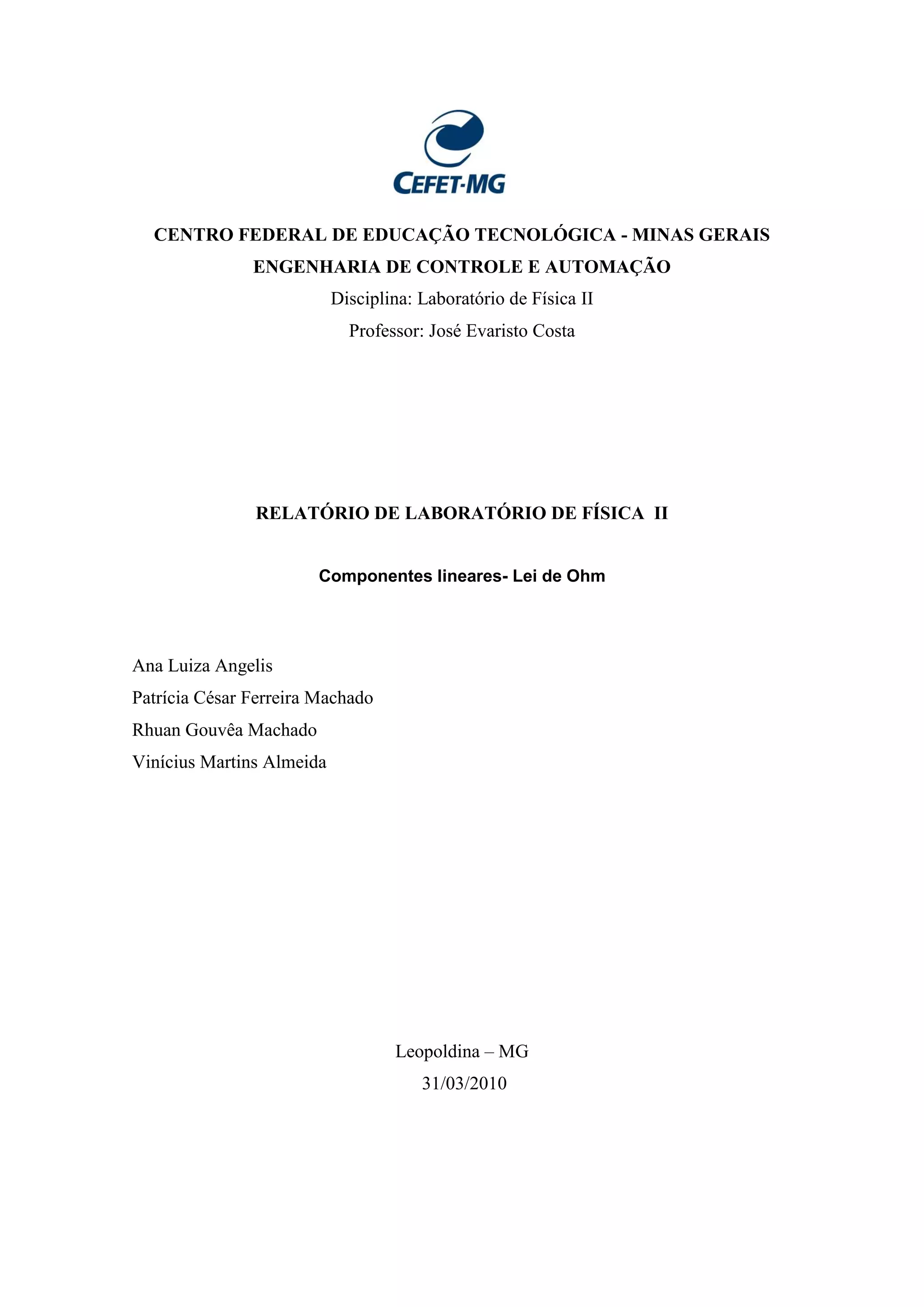 Este relatório descreve um experimento realizado para verificar a Lei de Ohm em circuitos elétricos. Os alunos mediram a tensão em vários níveis de corrente em um circuito que incluía uma fonte de tensão, um galvanômetro, um resistor e um multímetro. Embora os pontos de medição não estejam exatamente sobre uma linha reta, o gráfico de tensão versus corrente mostra uma relação linear que confirma a Lei de Ohm para este circuito.