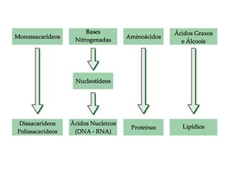 - Lipídios como óleos, gorduras e fosfolipídios, que têm função energética e estrutural;