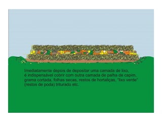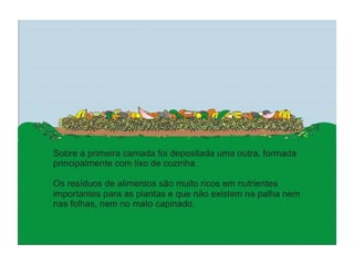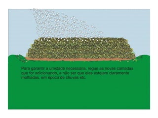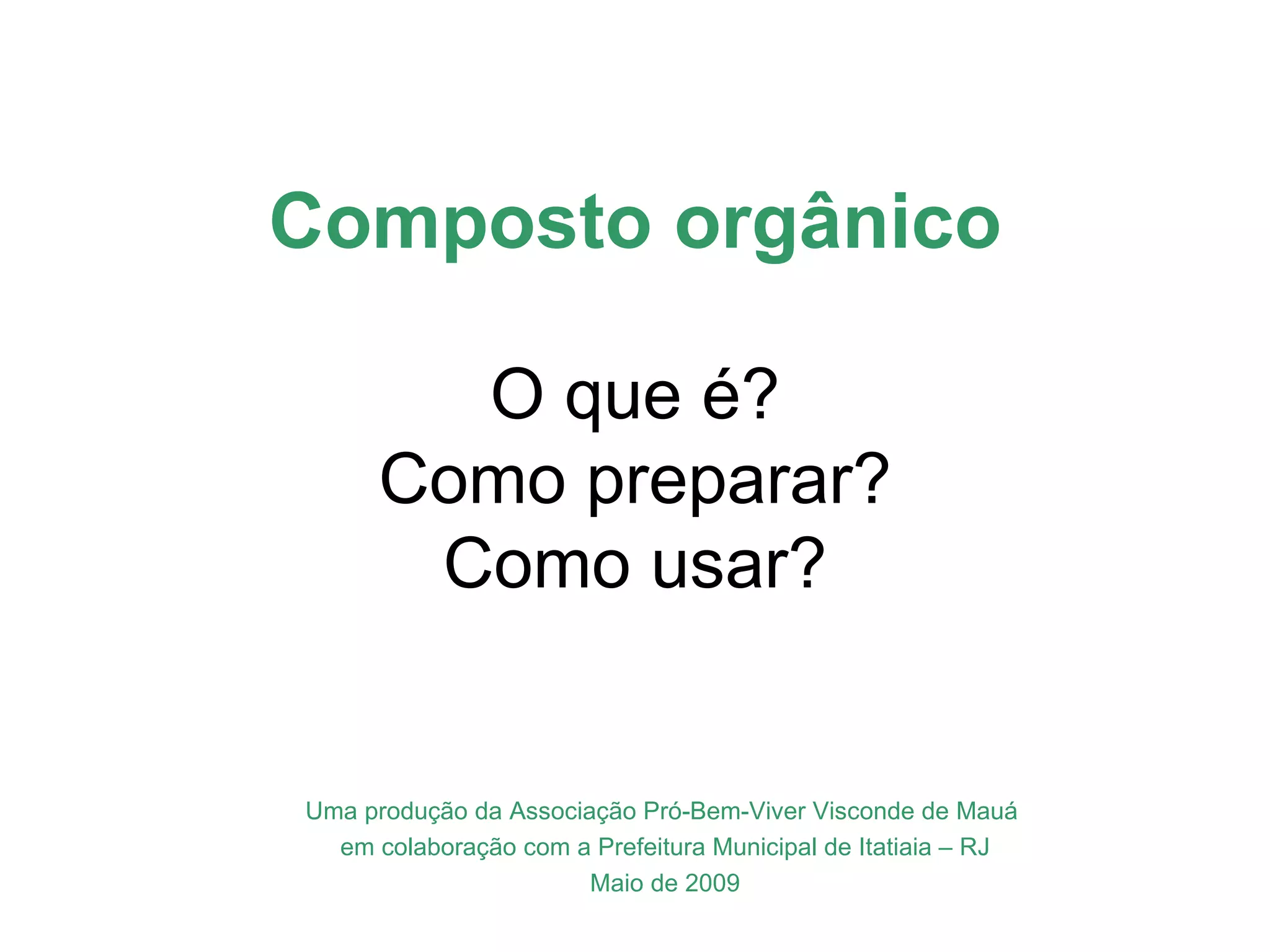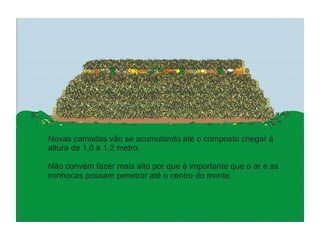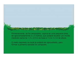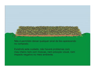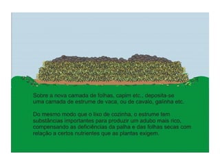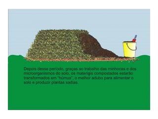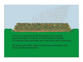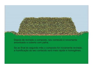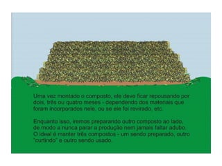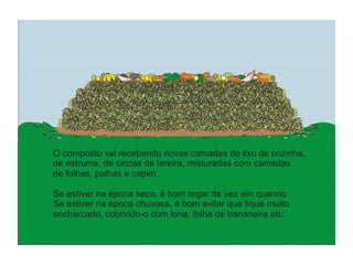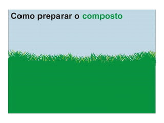 O documento explica o que é compostagem, como preparar composto orgânico misturando resíduos orgânicos e como usar o composto pronto para adubar a terra e cultivar plantas. Descreve os benefícios do composto no solo e nas plantas, e dá exemplos de como implantar um minicentro de compostagem em escolas.