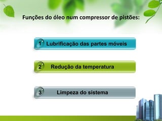 1) O documento discute as funções do óleo em compressores de pistões e as vantagens dos compressores isentos de óleo, incluindo ar mais puro, menores custos de manutenção e menor impacto ambiental.