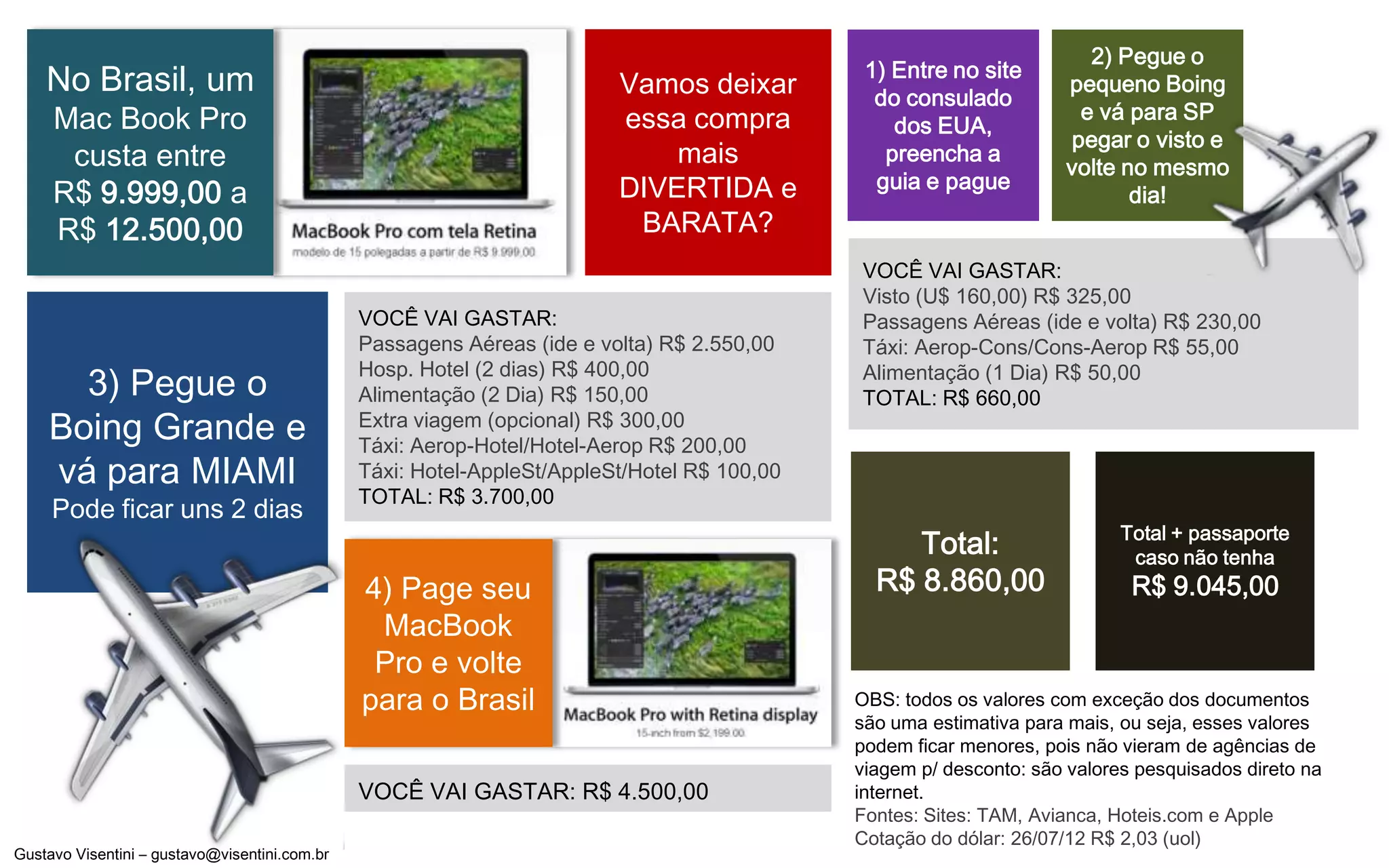 O documento detalha os custos estimados para uma viagem ao exterior para comprar um MacBook Pro, incluindo despesas como visto, passagens aéreas, hospedagem e alimentação. O total dos gastos varia entre R$ 8.860,00 e R$ 10.095,00, dependendo do destino e opções de viagem. Todas as despesas apresentadas são estimativas, sem descontos de agências de viagem.