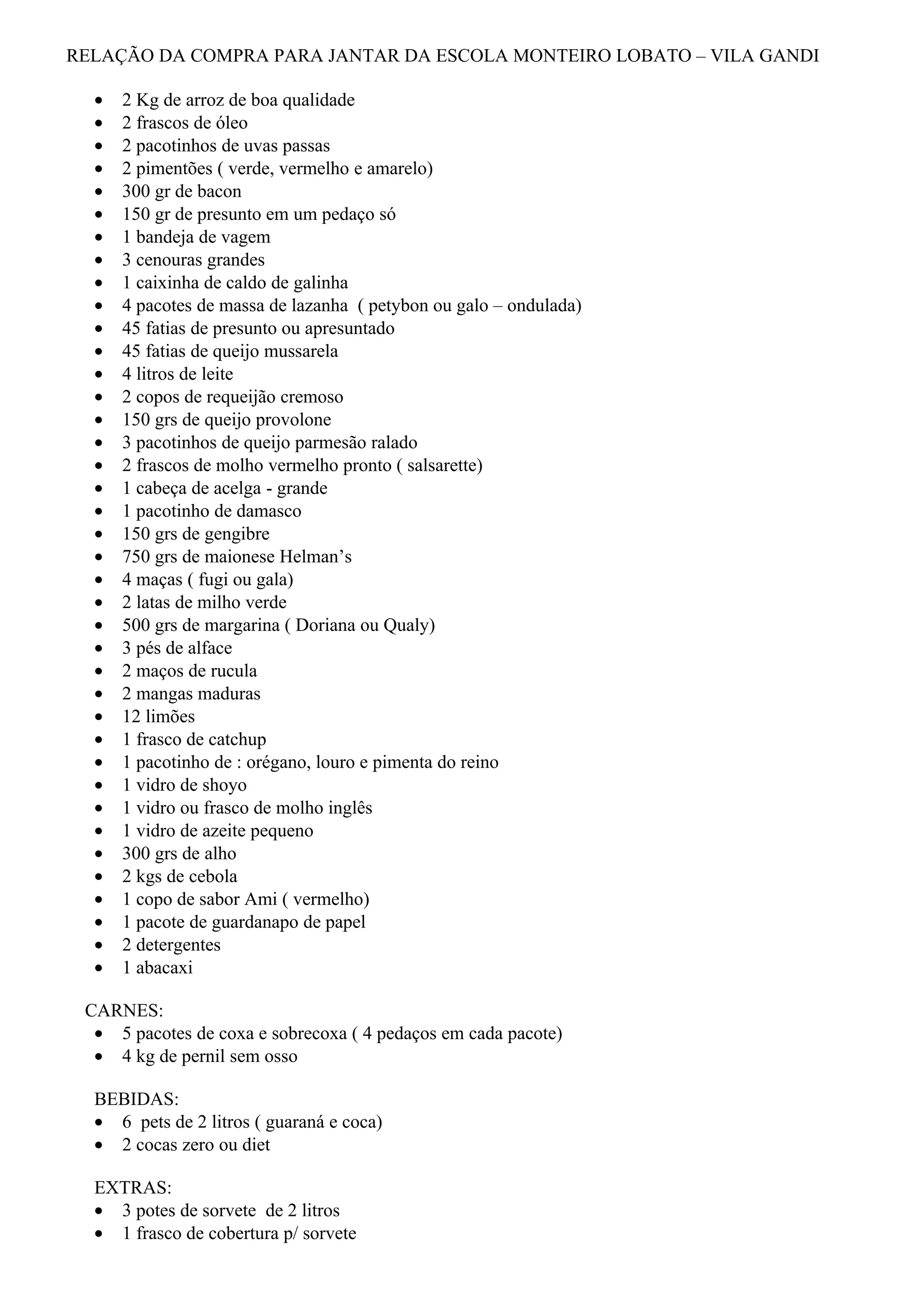 A lista de compras inclui itens para preparar jantar para uma escola, como arroz, óleo, massa, legumes, frutas, carnes como pernil e coxa e sobrecoxa de frango, molhos e condimentos. As bebidas incluem refrigerantes e as sobremesas sorvete e castanhas.