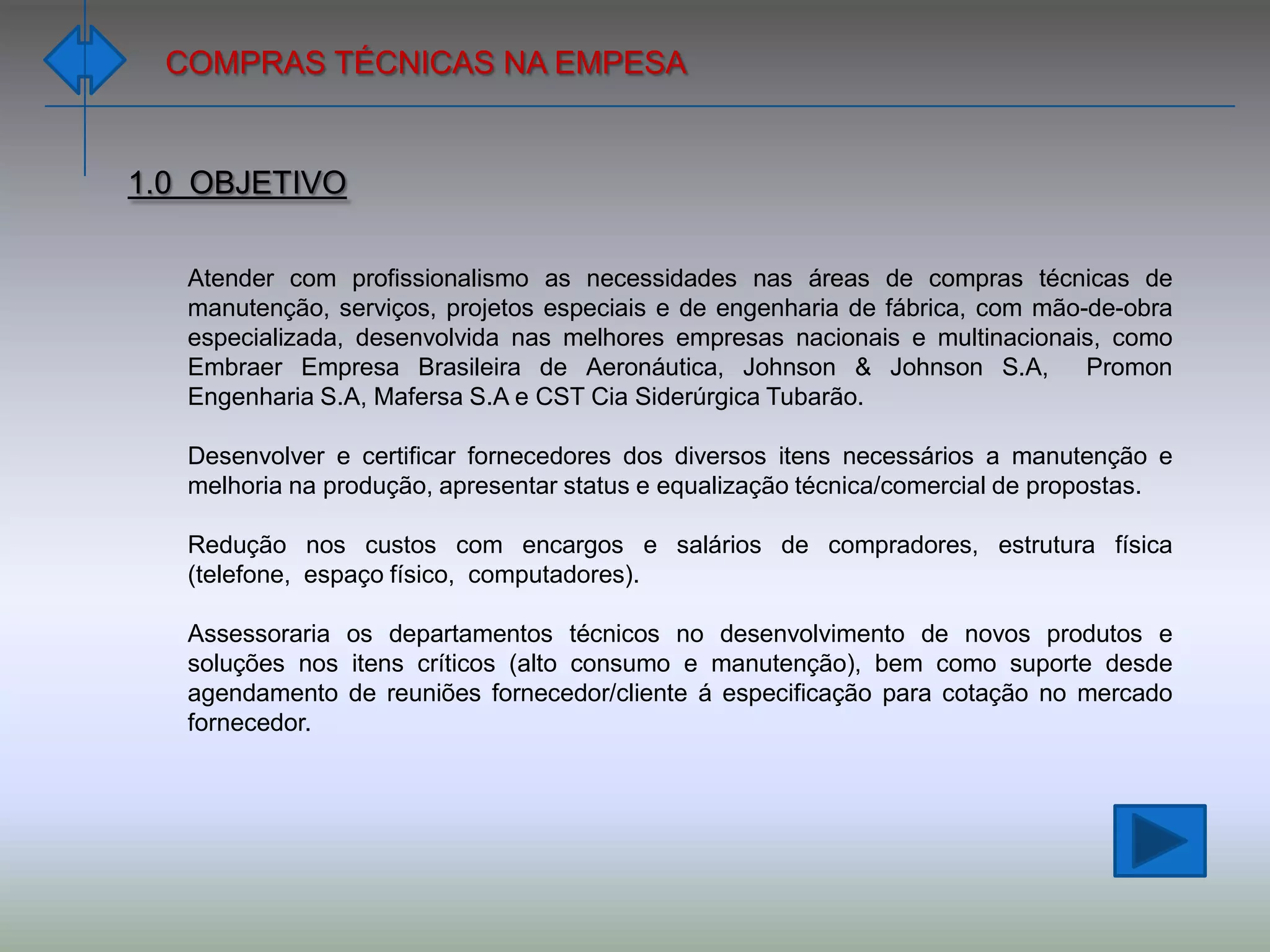 O documento descreve as atividades de compras técnicas de uma empresa, incluindo o objetivo de atender às necessidades de manutenção e projetos especiais, as áreas operacionais de materiais elétricos, mecânicos e instrumentação, e os serviços de suporte a projetos especiais e compras emergenciais.