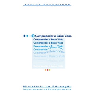 Este documento fornece informações sobre a visão e a baixa visão. Discute a estrutura do aparelho da visão, causas e consequências da baixa visão, principais patologias, e sinais de alerta. Também aborda a avaliação clínica e funcional da visão, e formas de auxiliar alunos com baixa visão, incluindo o uso de auxiliares técnicos e estratégias de aprendizagem.