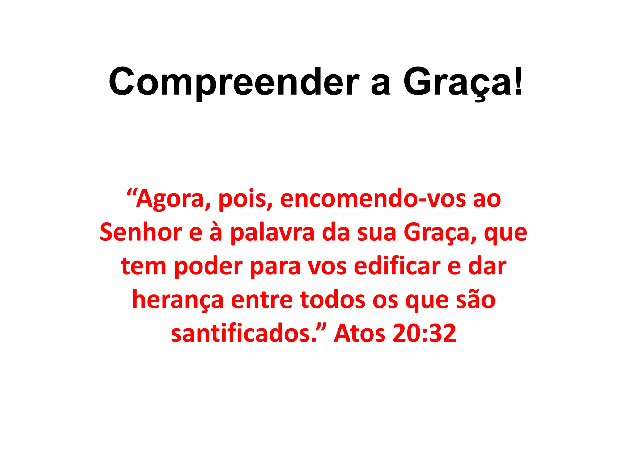 O documento discute a graça de Deus e como ela permite a salvação através da fé em Jesus Cristo, não por obras. A graça liberta os cristãos do jugo da lei e da servidão. Alguns sistemas religiosos tentam impor regras e rituais que não vêm de Cristo, como circuncisão, e pregam um "evangelho do terror" baseado no medo.