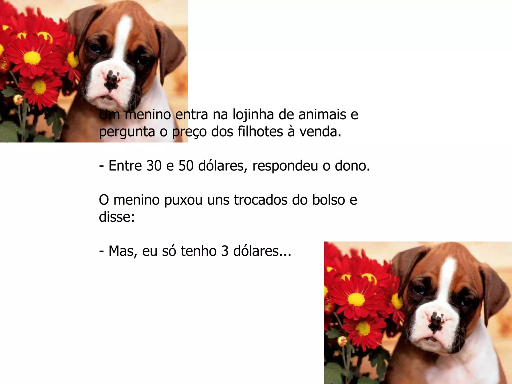 Um menino com uma prótese na perna quer comprar um filhote manco, oferecendo pagar aos poucos. O dono da loja inicialmente oferece dar o filhote de graça, mas o menino insiste em pagar, entendendo que o cachorro precisará de alguém que o compreenda, assim como ele mesmo precisa.