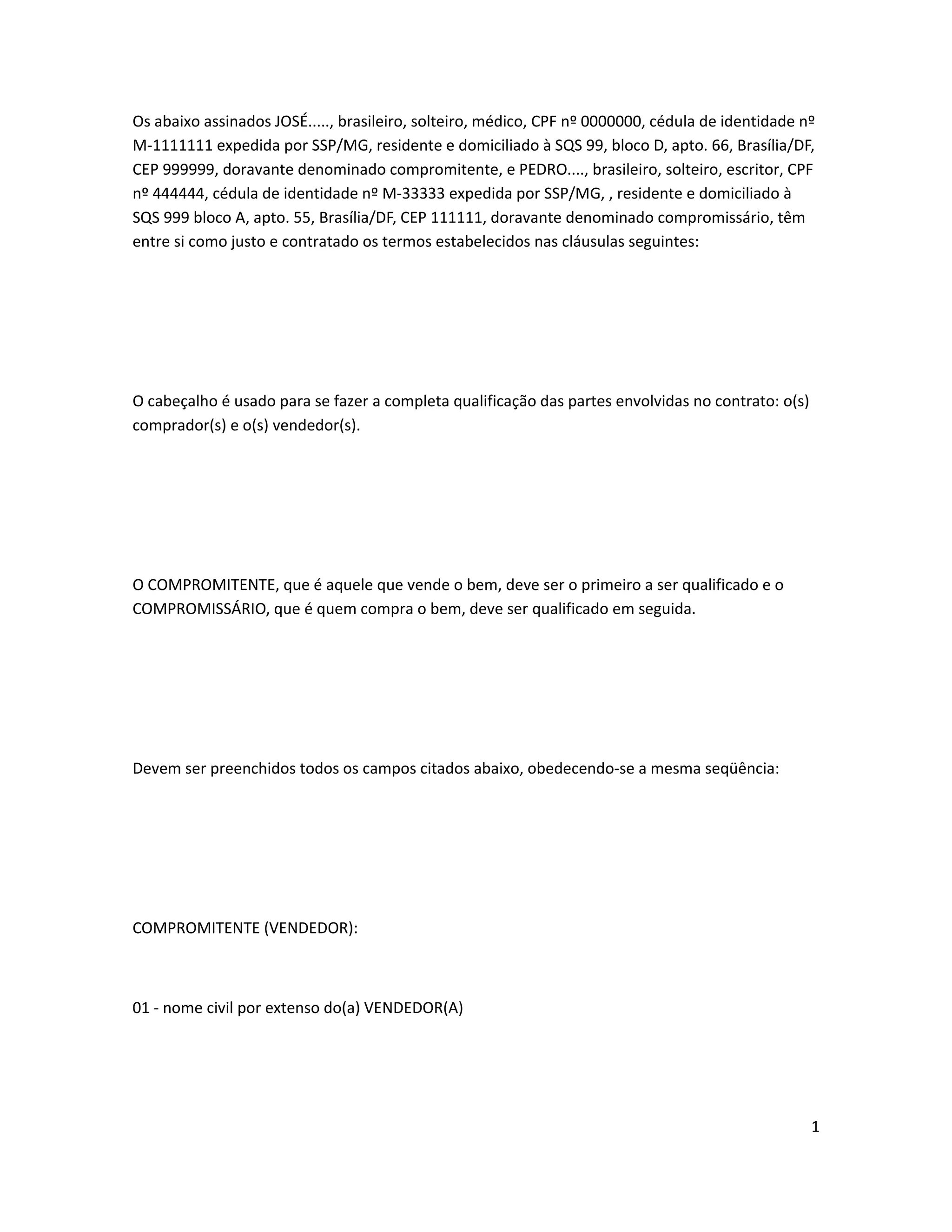 Este documento é um contrato de compromisso de compra e venda de um terreno entre José e Pedro. O contrato especifica os detalhes das partes envolvidas, como nome, documentos e endereço. Também define o objeto da compra, o preço, condições de pagamento, direitos e obrigações de cada parte, possibilidade de rescisão e escolha do foro para solução de eventuais disputas.