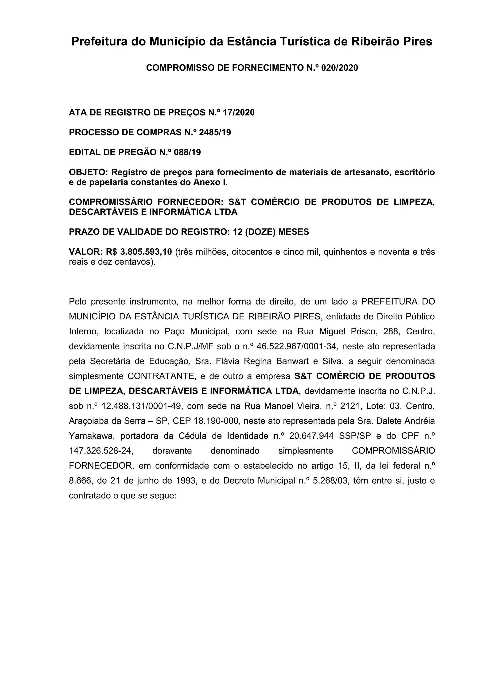 Este documento registra um compromisso de fornecimento entre a Prefeitura de Ribeirão Pires e a empresa S&T Comércio para o fornecimento de materiais de artesanato, escritório e papelaria no valor total de R$ 3.805.593,10 por um período de 12 meses. O documento define as obrigações das partes, preços, condições de pagamento, penalidades e outras cláusulas do contrato.
