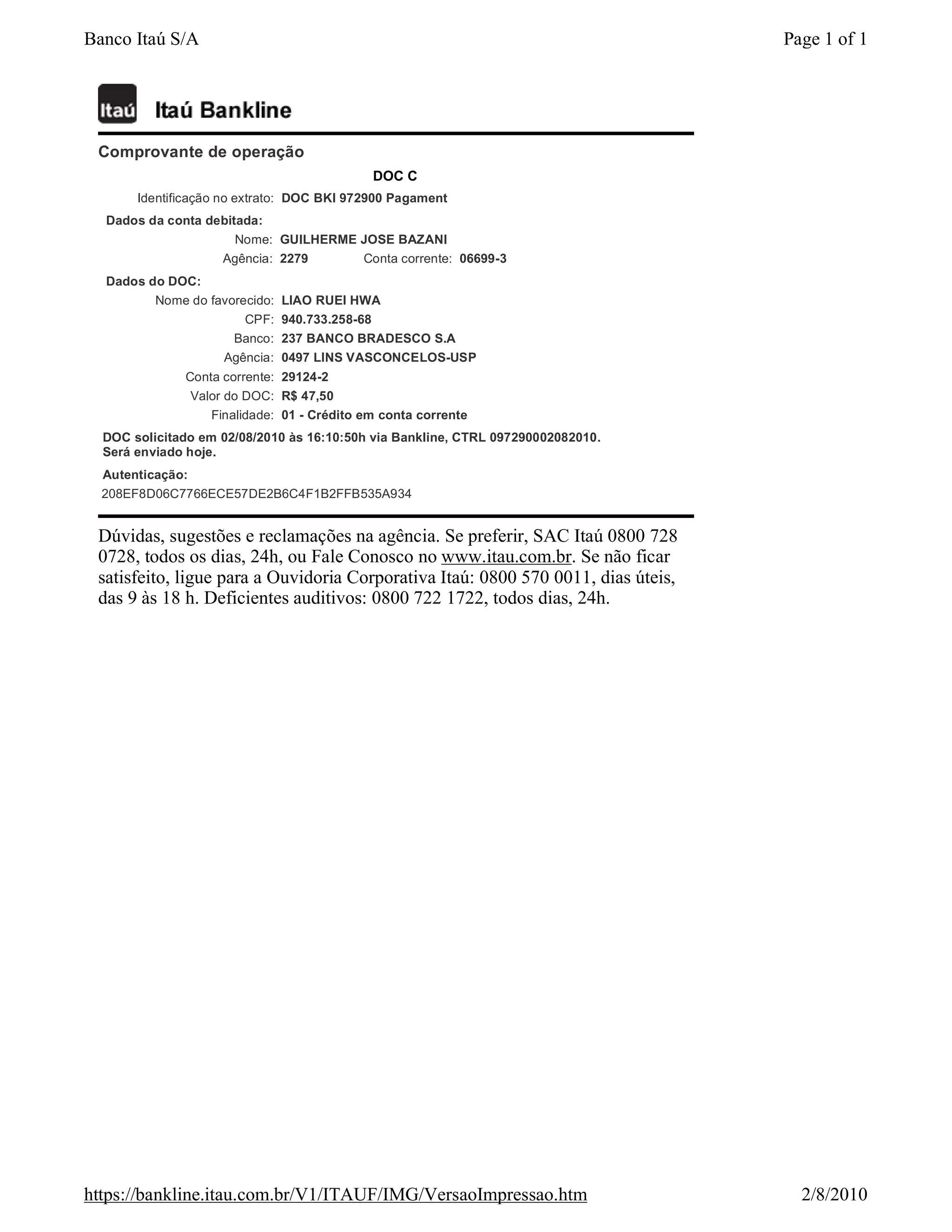 O documento fornece detalhes de uma transferência bancária DOC realizada entre contas. Ele lista os dados do remetente e destinatário, incluindo nomes, CPFs, bancos, agências e contas. Também especifica o valor de R$47,50 transferido e a finalidade do pagamento como crédito em conta corrente.
