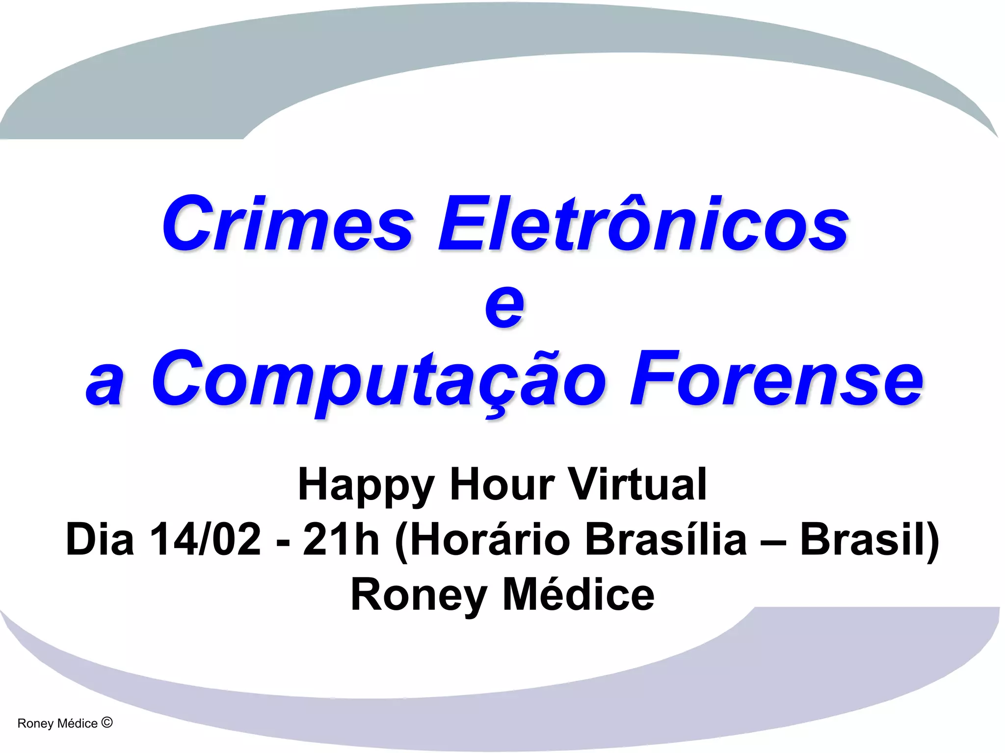 O documento discute computação forense e crimes eletrônicos. Apresenta a agenda do evento "Happy Hour Virtual" incluindo introdução à computação forense, crimes eletrônicos, o processo de investigação e ferramentas forenses. Também resume o currículo de Roney Médice.