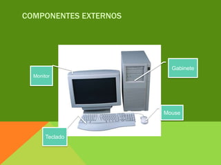 O documento descreve os principais componentes externos de um computador: o monitor exibe informações, o gabinete contém os circuitos internos, o teclado é usado para digitar e o mouse movimenta o cursor e seleciona ações.
