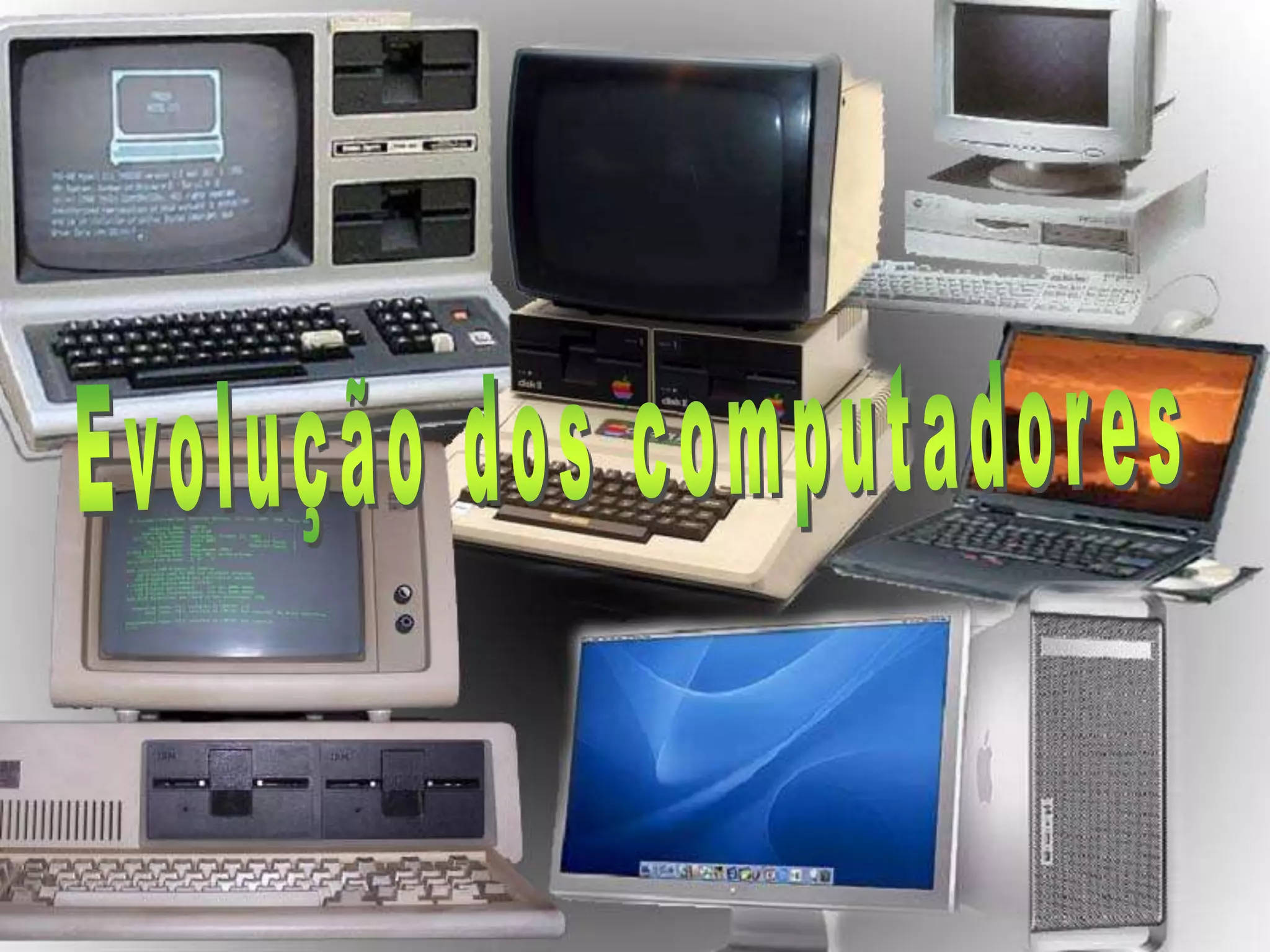 O ENIAC foi o primeiro computador eletrônico em 1946. Os primeiros computadores pessoais como o Apple II surgiram em 1977, enquanto o IBM PC popularizou os PCs em 1981. A evolução dos processadores incluiu o Pentium na década de 1990 e o Core 2 sucessor do Pentium.