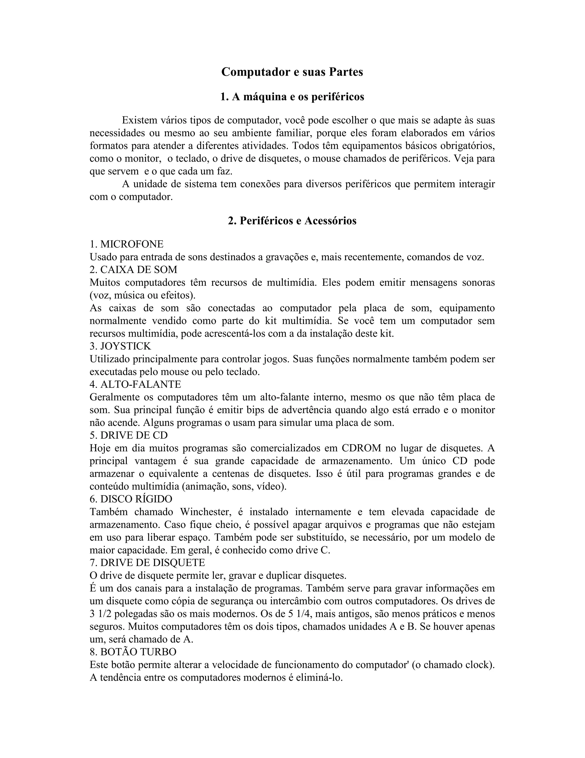 O documento descreve as principais partes de um computador e seus periféricos, incluindo monitores, teclados, mouses, caixas de som, discos rígidos e drives. Ele também explica como conectar esses diferentes componentes corretamente e os conceitos básicos de hardware e software.