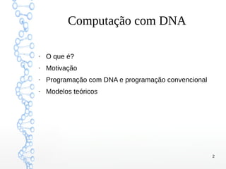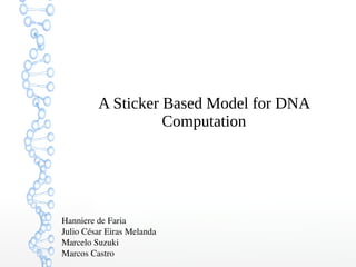 O documento descreve um modelo computacional baseado em fitas de DNA chamado "Sticker Based Model". O modelo representa informação usando fitas de DNA divididas em regiões e "stickers" complementares que se ligam às regiões para representar bits. O modelo suporta operações básicas como combinar, separar, definir e resetar bits manipulando a ligação e remoção dos stickers.