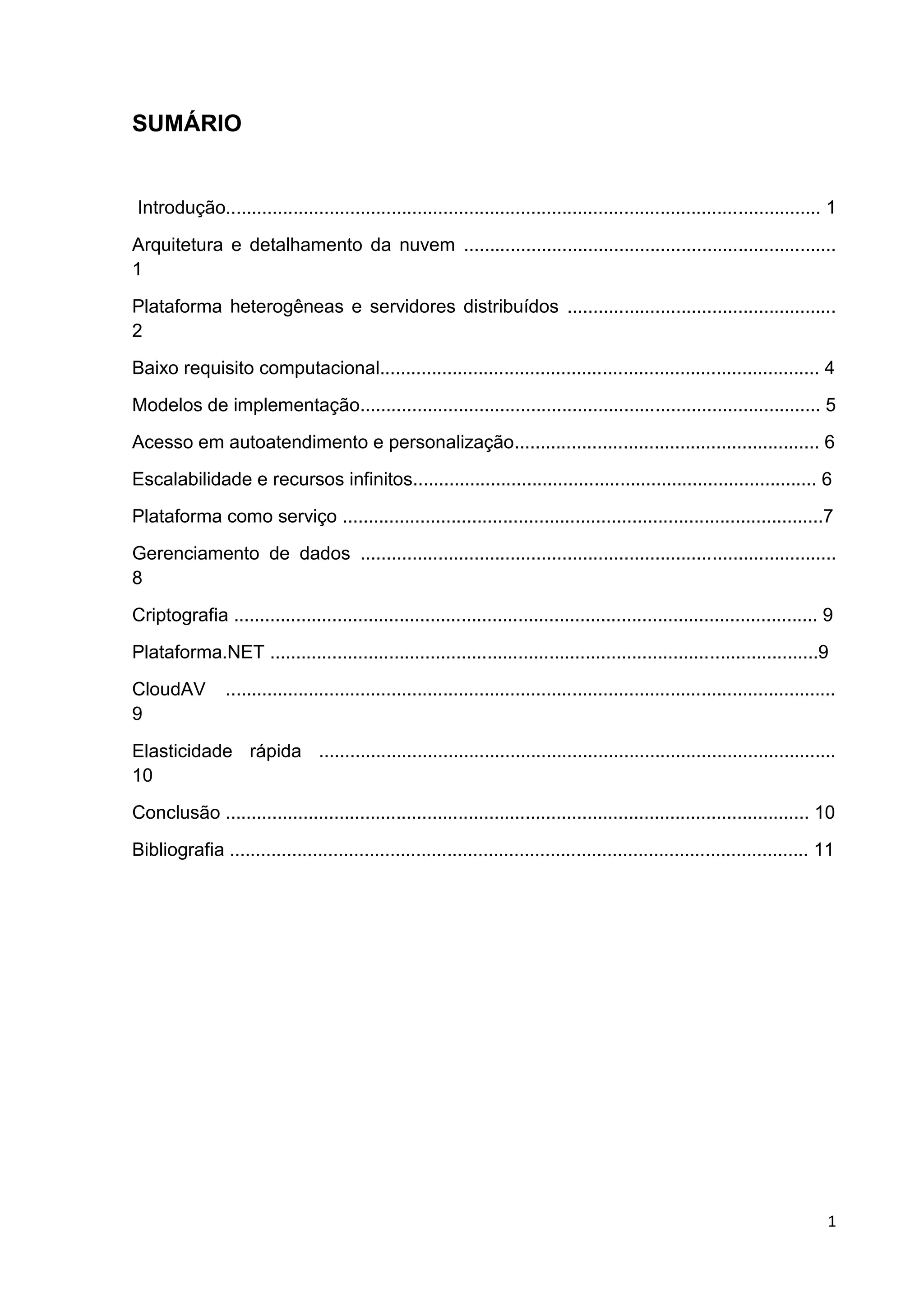 O documento discute os conceitos e arquitetura da computação em nuvem, incluindo: (1) A arquitetura é baseada em três camadas - infraestrutura, plataforma e aplicação; (2) Os recursos são fornecidos através de redes heterogêneas e servidores distribuídos para permitir acesso em diferentes dispositivos; (3) A computação em nuvem oferece baixo requisito computacional e custo reduzido para usuários e empresas.