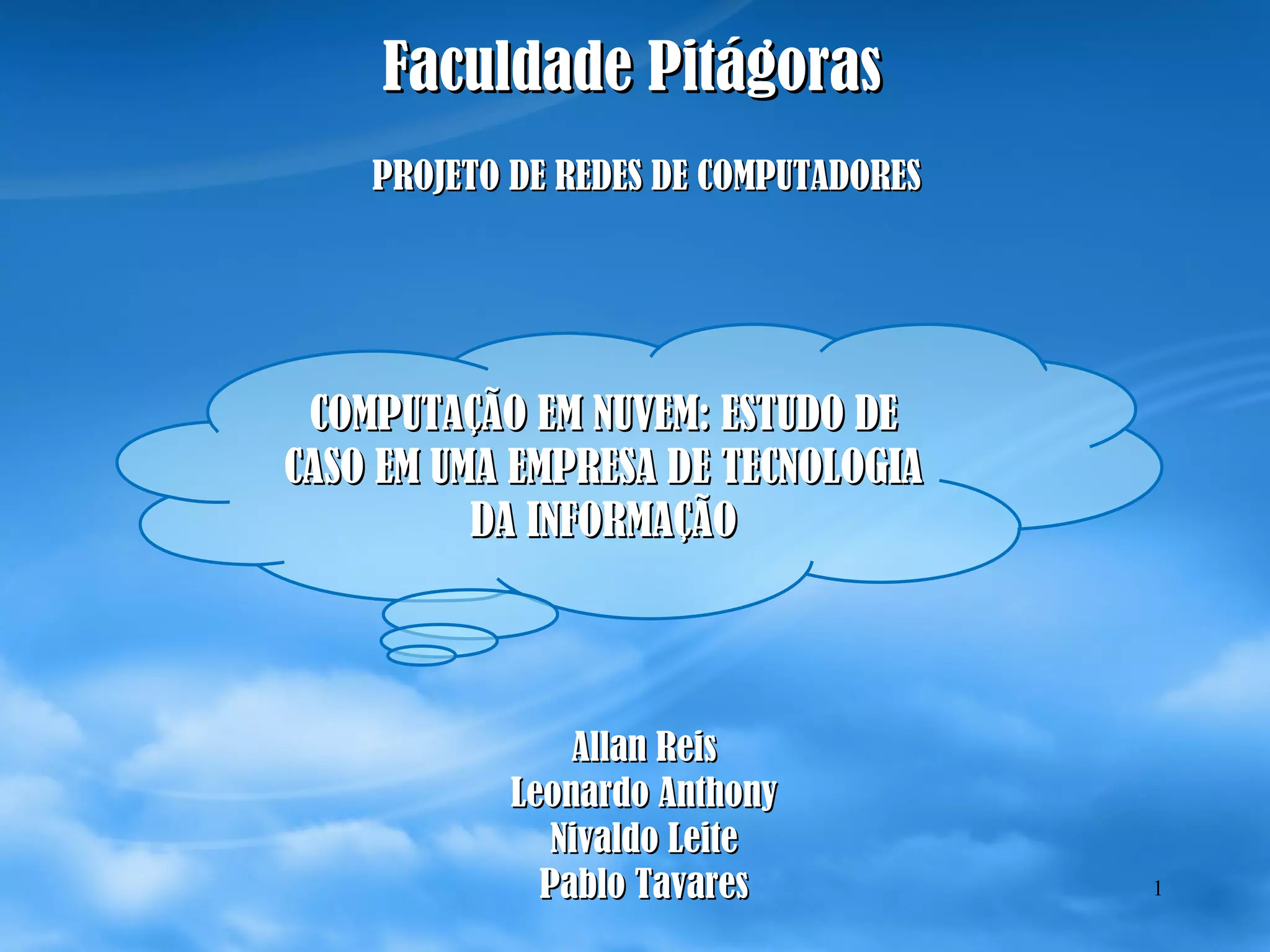 COMPUTAÇÃO EM NUVEM:ESTUDO DE CASO EM UMA EMPRESA DE TECNOLOGIA DA INFORMAÇÃO Allan Reis Leonardo Anthony Nivaldo Leite Pablo Tavares Faculdade Pitágoras PROJETO DE REDES DE COMPUTADORES