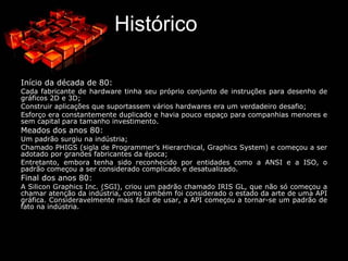 Histórico Início dadécada de 80: Cada fabricante de hardware tinha seu próprio conjunto de instruções para desenho de gráficos 2D e 3D;