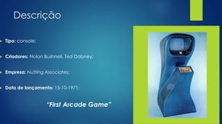 Computer Space foi o primeiro jogo de arcade lançado em 1971 pela Nutting Associates, criado por Nolan Bushnell e Ted Dabney. Foi inovador por estabelecer o formato básico dos arcades e por ser o primeiro a usar moedas, porém não teve muito sucesso comercial devido à dificuldade dos controles.