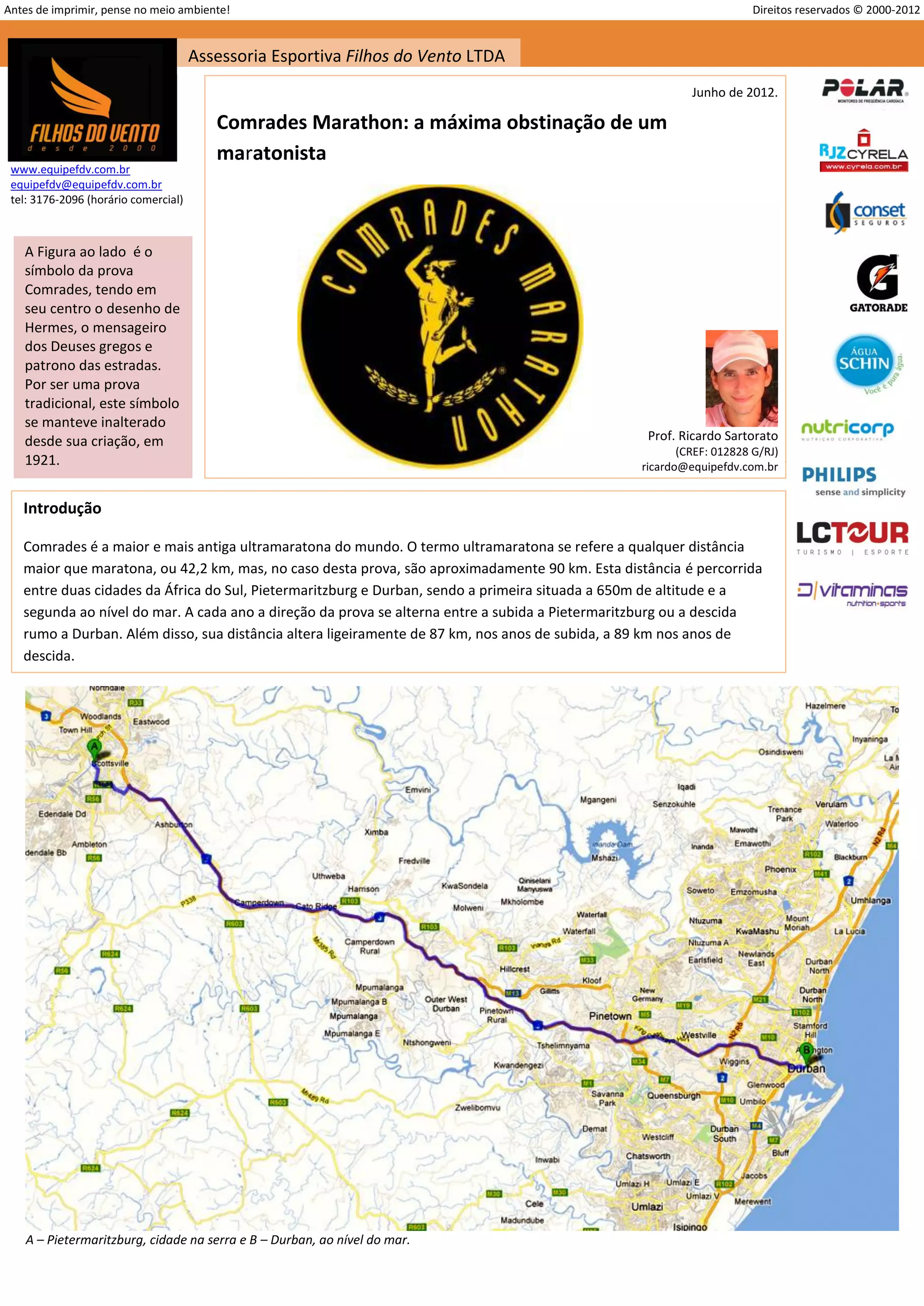 O documento descreve a ultramaratona Comrades, realizada anualmente na África do Sul entre as cidades de Pietermaritzburg e Durban. A prova tem aproximadamente 90 km e é considerada a maior e mais antiga ultramaratona do mundo. Sua origem remonta a 1921 e foi idealizada por Vic Clapham para homenagear os soldados sul-africanos mortos na Primeira Guerra Mundial.
