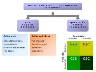 O documento discute o conceito, histórico, classificação, vantagens, desvantagens e futuro do comércio eletrônico. Ele define comércio eletrônico como transações comerciais feitas através de equipamentos eletrônicos como computadores e discute como o comércio eletrônico no Brasil cresceu significativamente nos últimos anos.