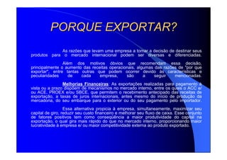 Exportar traz diversos benefícios financeiros e operacionais para as empresas, como receber antecipadamente por exportações, melhorar fluxo de caixa, ganhar prestígio no mercado interno, e adotar técnicas de produção e controle de qualidade que também melhoram o desempenho no mercado doméstico. Exportar também ajuda a diluir riscos comerciais ao não depender de apenas um mercado, e permite a aquisição indireta de tecnologia e know-how de importadores.