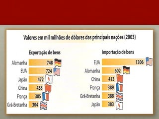 1) Os países se especializam em determinados produtos de acordo com suas características, levando ao comércio internacional onde países trocam produtos.