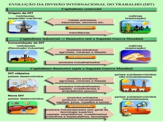 O documento discute os principais aspectos do comércio internacional, incluindo: 1) os tipos de comércio entre países (multilateral e regional); 2) estatísticas sobre o volume do comércio internacional; 3) o papel crescente das multinacionais; 4) a origem da divisão internacional do trabalho; 5) a Organização Mundial do Comércio como reguladora; 6) os principais produtos das exportações e importações brasileiras; 7) os desafios do Brasil no comércio internacional.