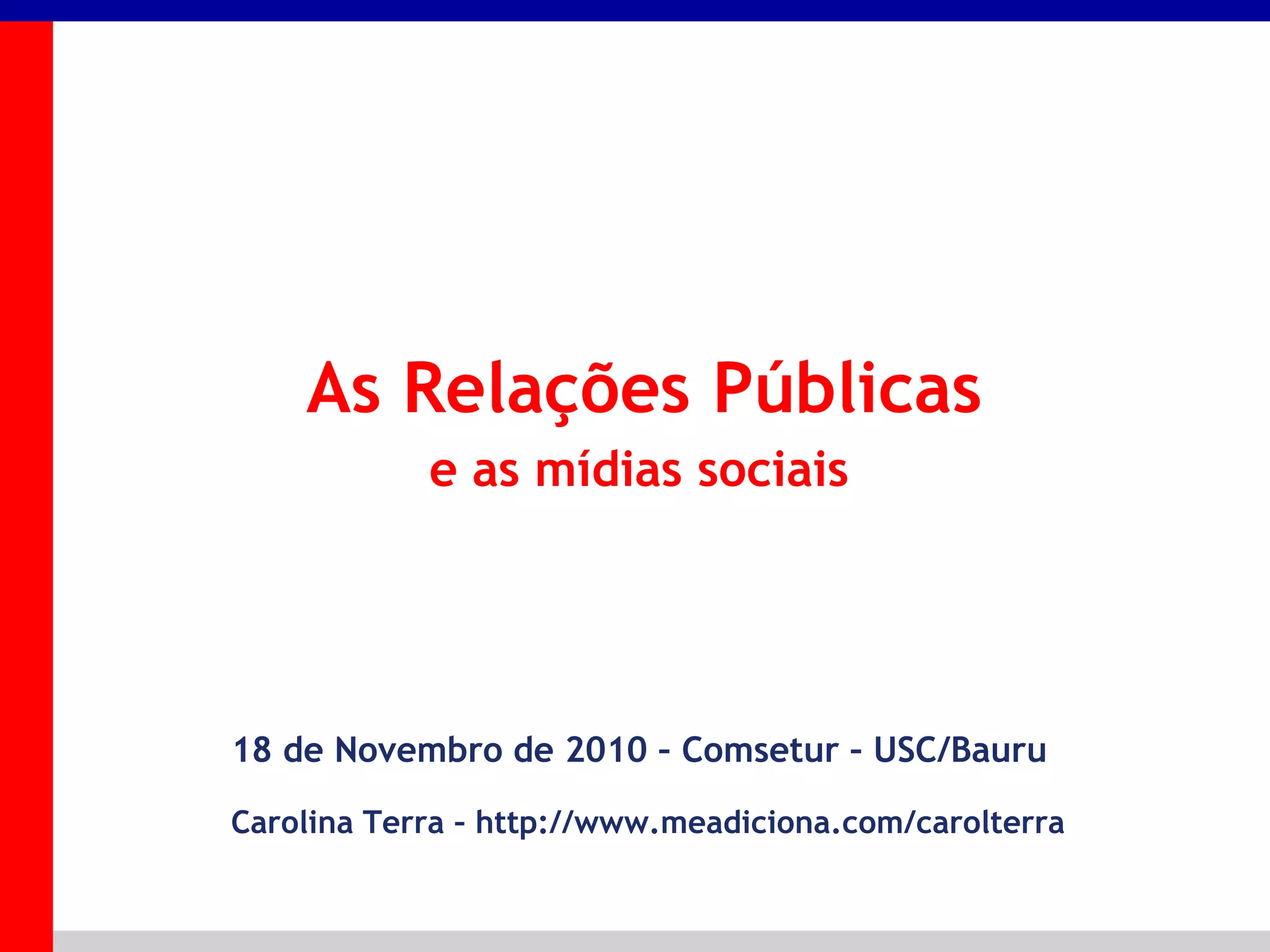 O documento discute o uso das mídias sociais pelas empresas, incluindo casos de sucesso e problemas. Aborda tópicos como a importância da reputação online, políticas para redes sociais corporativas e como grandes empresas estruturam suas equipes de mídia social.