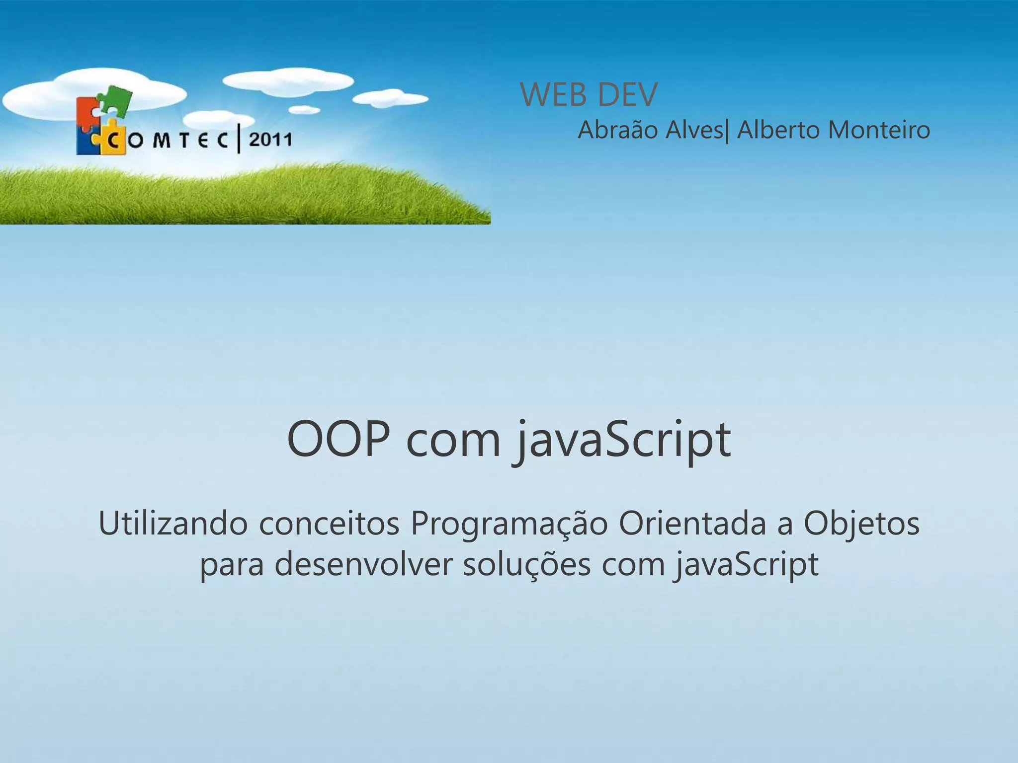O documento apresenta conceitos de programação orientada a objetos em JavaScript, abordando objetos literais, o operador new, herança com prototype e polimorfismo. A agenda inclui introdução à linguagem, dicas e referências para aprendizado.