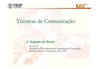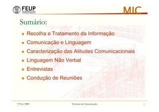 O documento discute técnicas de comunicação, incluindo a recolha e tratamento da informação, comunicação e linguagem, atitudes comunicacionais, linguagem não verbal, entrevistas e condução de reuniões. Fornece detalhes sobre cada um desses tópicos e oferece dicas práticas para melhorar as habilidades comunicacionais.