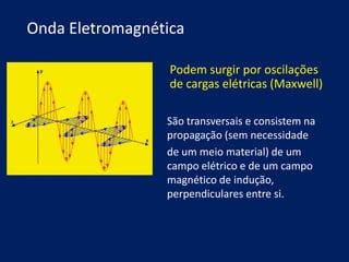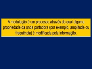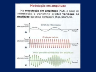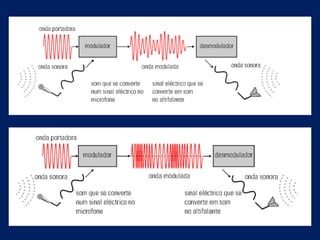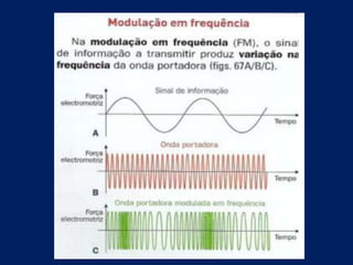 O documento discute a comunicação sem fios através de ondas eletromagnéticas, explicando que estas podem ser usadas para transmitir informação sem a necessidade de um meio material. É descrito como um sinal elétrico pode ser transmitido sem fios de um emissor para um receptor através da modulação de uma onda portadora com o sinal de informação.