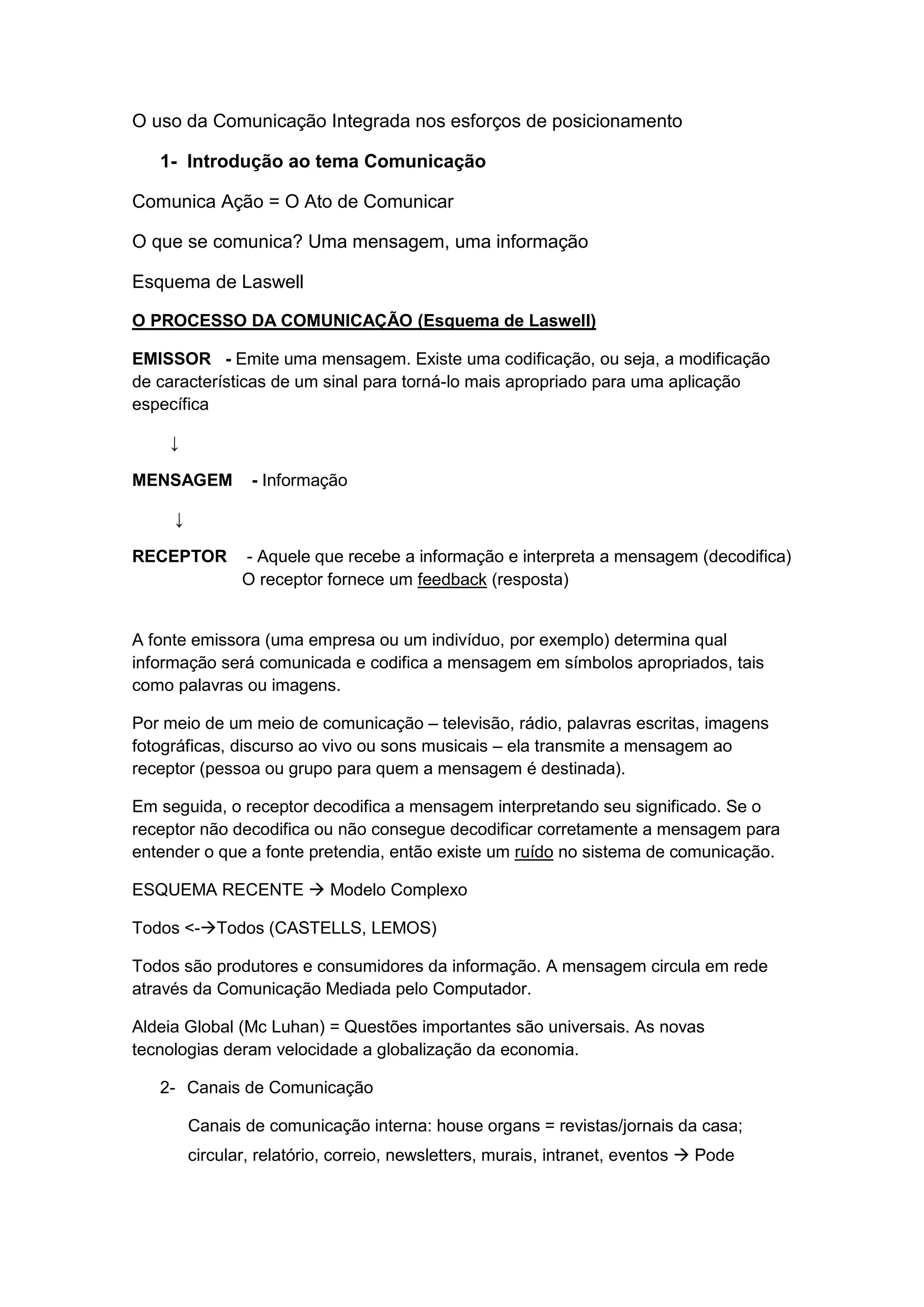 O documento discute a comunicação integrada e sua importância para as estratégias de posicionamento de uma empresa. Ele explica que a comunicação integrada une diferentes canais de comunicação interna e externa, como marketing, vendas e relações públicas, para enviar mensagens consistentes aos públicos-alvo. A comunicação integrada é planejada estratégicamente para fixar a marca e a imagem da empresa na mente dos consumidores e gerar atitudes favoráveis.