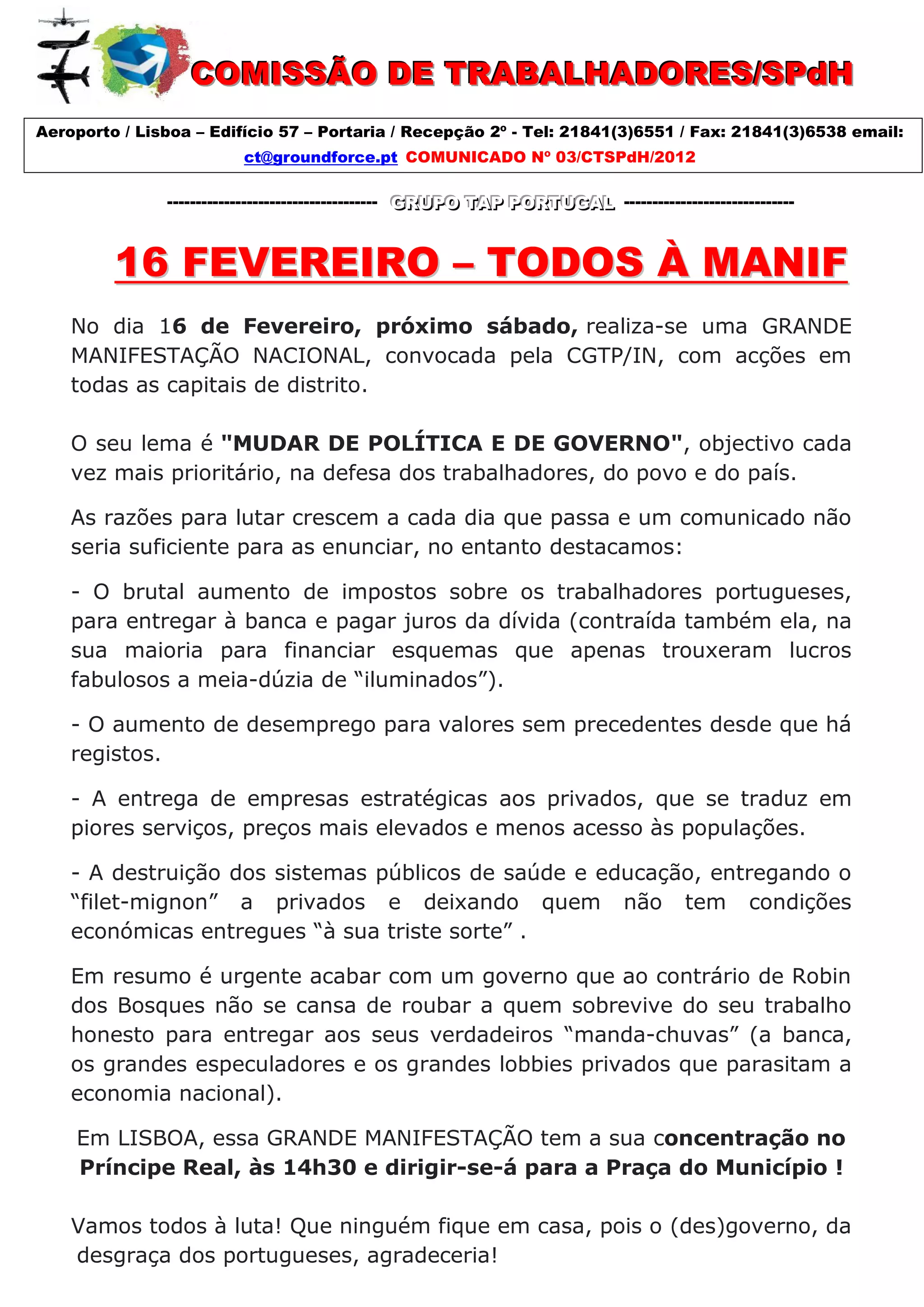 O documento convoca os trabalhadores para uma grande manifestação nacional no dia 16 de fevereiro contra o governo e suas políticas. As razões incluem o aumento de impostos, desemprego e privatizações que prejudicam os serviços públicos. A manifestação em Lisboa irá da Praça do Príncipe Real até a Praça do Município.