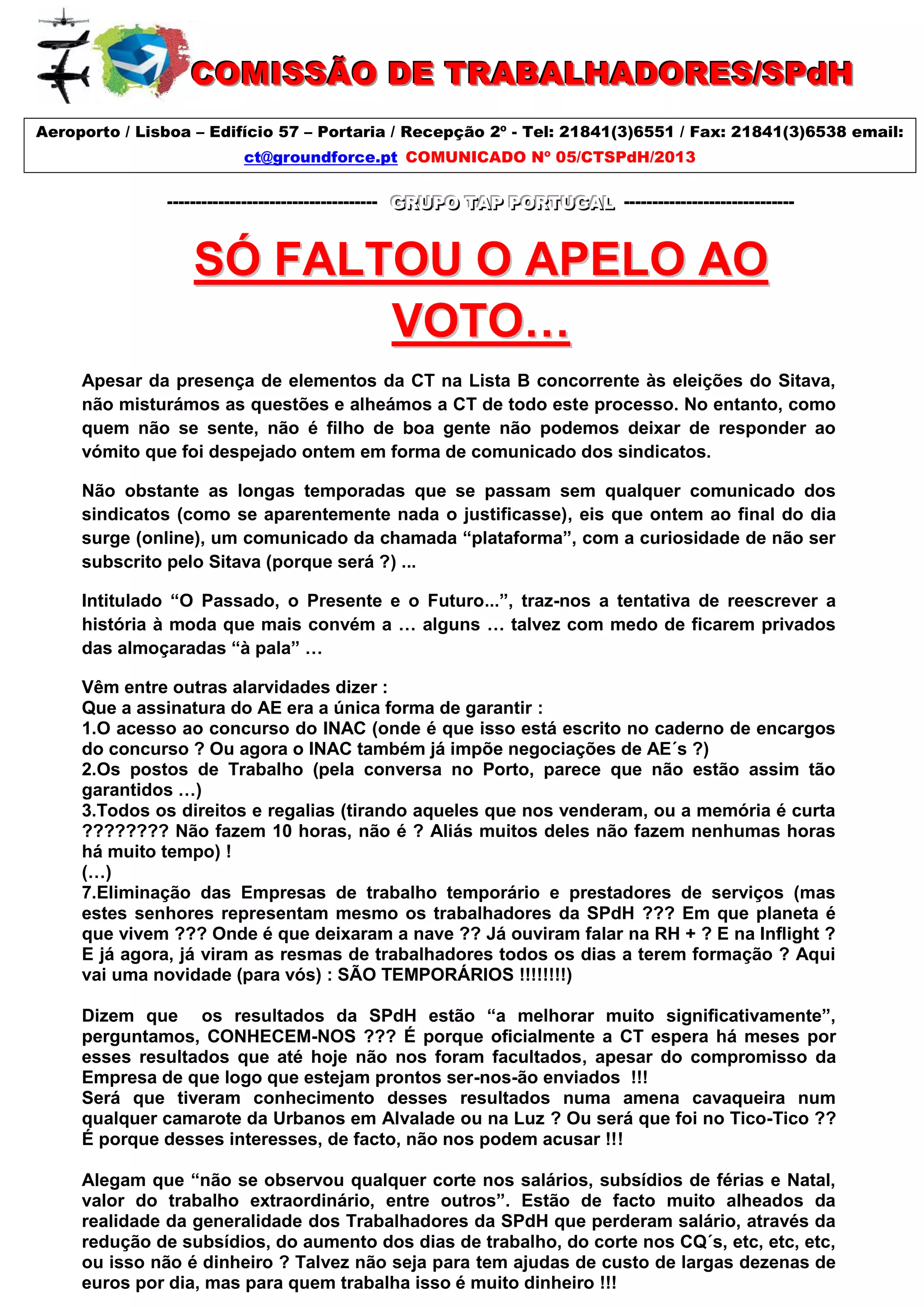 A Comissão de Trabalhadores da SPdH critica um comunicado de sindicatos que apoia a administração da empresa e faz um apelo ao voto em uma lista nas eleições sindicais. A Comissão alega que o comunicado tenta reescrever a história e ignora os problemas reais dos trabalhadores como cortes salariais. Eles também questionam a independência dos sindicatos em relação à administração da empresa.