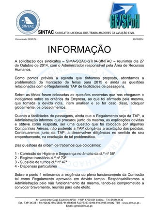 1. Os sindicatos reuniram-se com a administração da empresa para discutir questões como férias para 2015, facilidades de passagens e regulamentos.