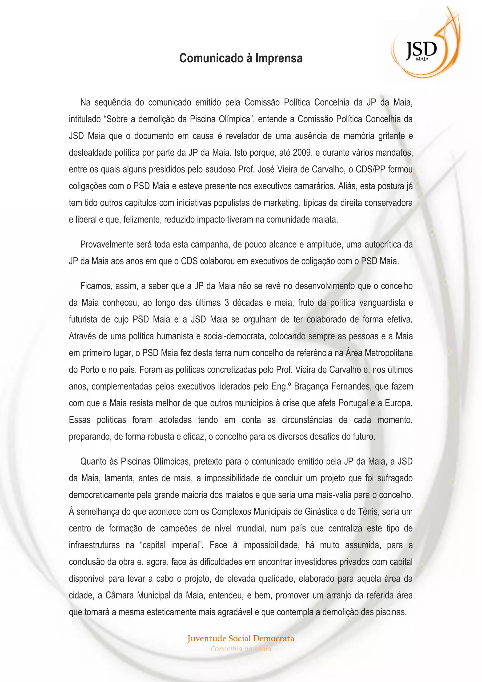 Este documento é uma resposta da Juventude Social Democrata da Maia (JSD Maia) a um comunicado anterior da Juventude Popular da Maia (JP Maia) sobre a demolição da Piscina Olímpica. A JSD Maia critica a JP Maia por falta de memória e lealdade política, dado que o CDS/PP colaborou anteriormente com o PSD Maia. A JSD Maia também defende as políticas do PSD Maia que desenvolveram o concelho da Maia.