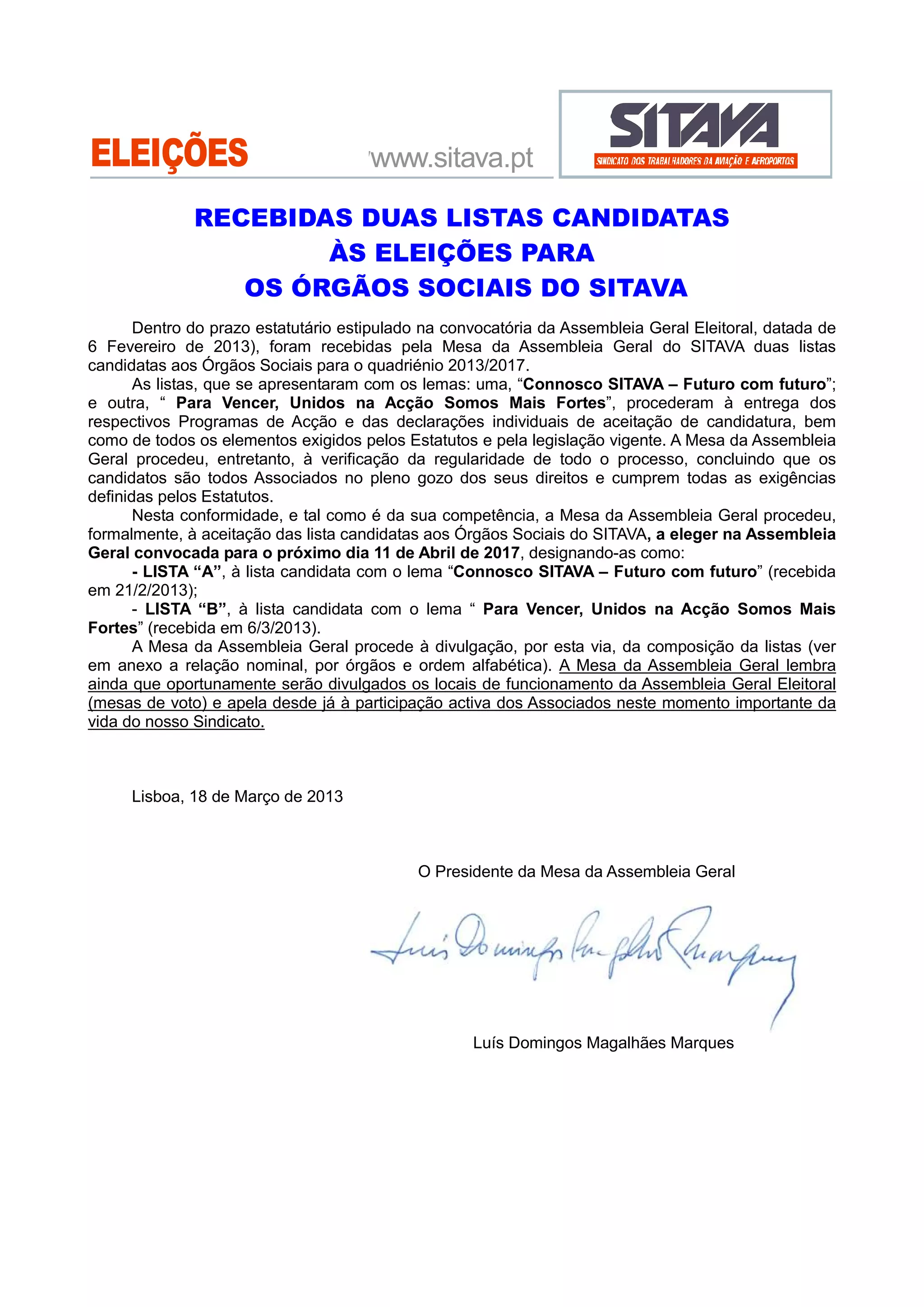 Duas listas candidatas foram recebidas para as eleições dos órgãos sociais do SITAVA para o quadriénio de 2013-2017. As listas apresentaram programas de ação e declarações de aceitação de candidatura. A Mesa da Assembleia Geral verificou a elegibilidade dos candidatos e aceitou formalmente as duas listas, designando-as como Lista A e Lista B.