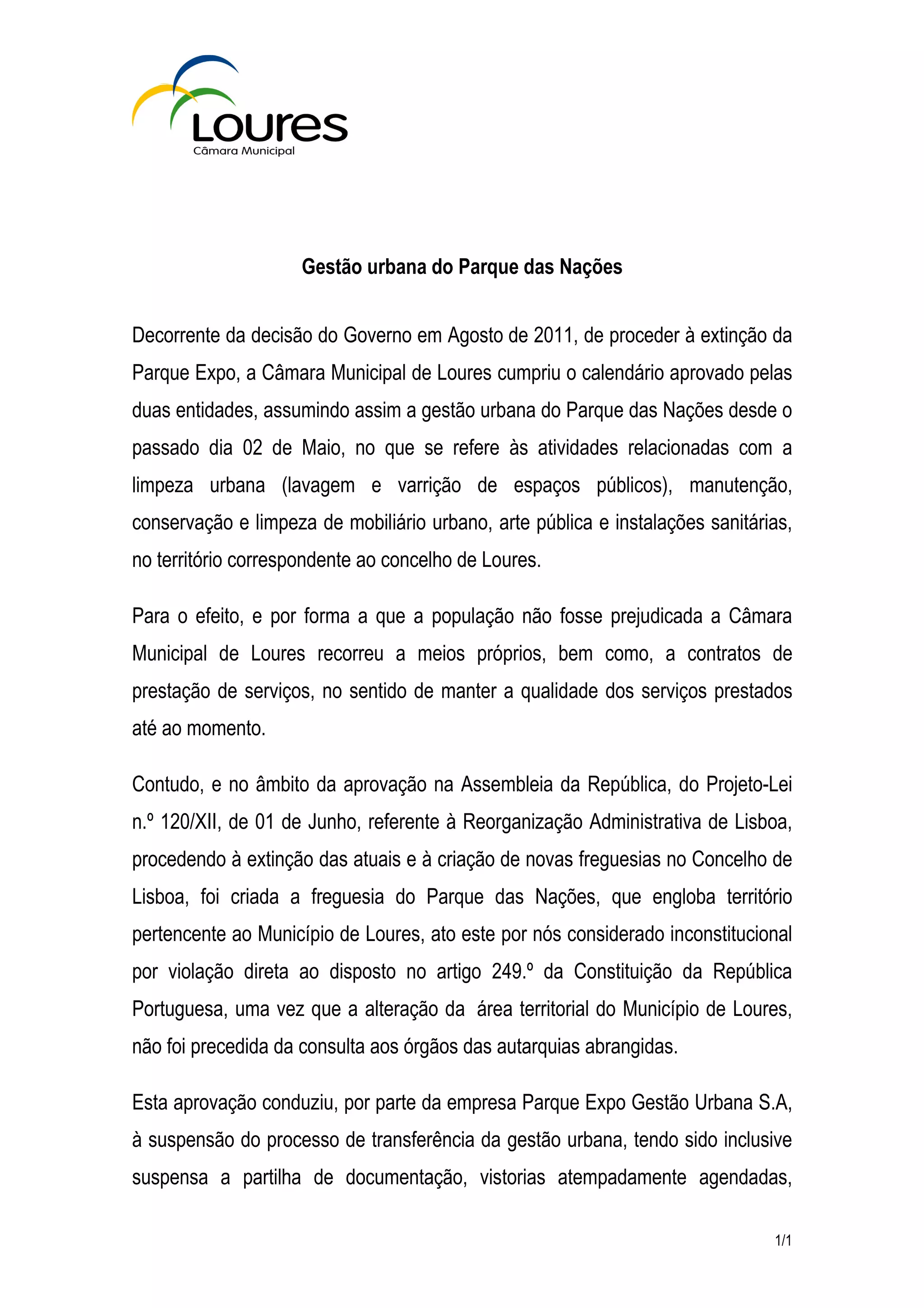 A Câmara Municipal de Loures assumiu a gestão urbana do Parque das Nações em maio, mas a criação da freguesia do Parque das Nações pelo governo de Lisboa violou a constituição e levou a Parque Expo Gestão Urbana S.A. a suspender a transferência de gestão. Como resultado, a Câmara Municipal de Loures irá cessar suas atividades no Parque das Nações em 1 de julho.