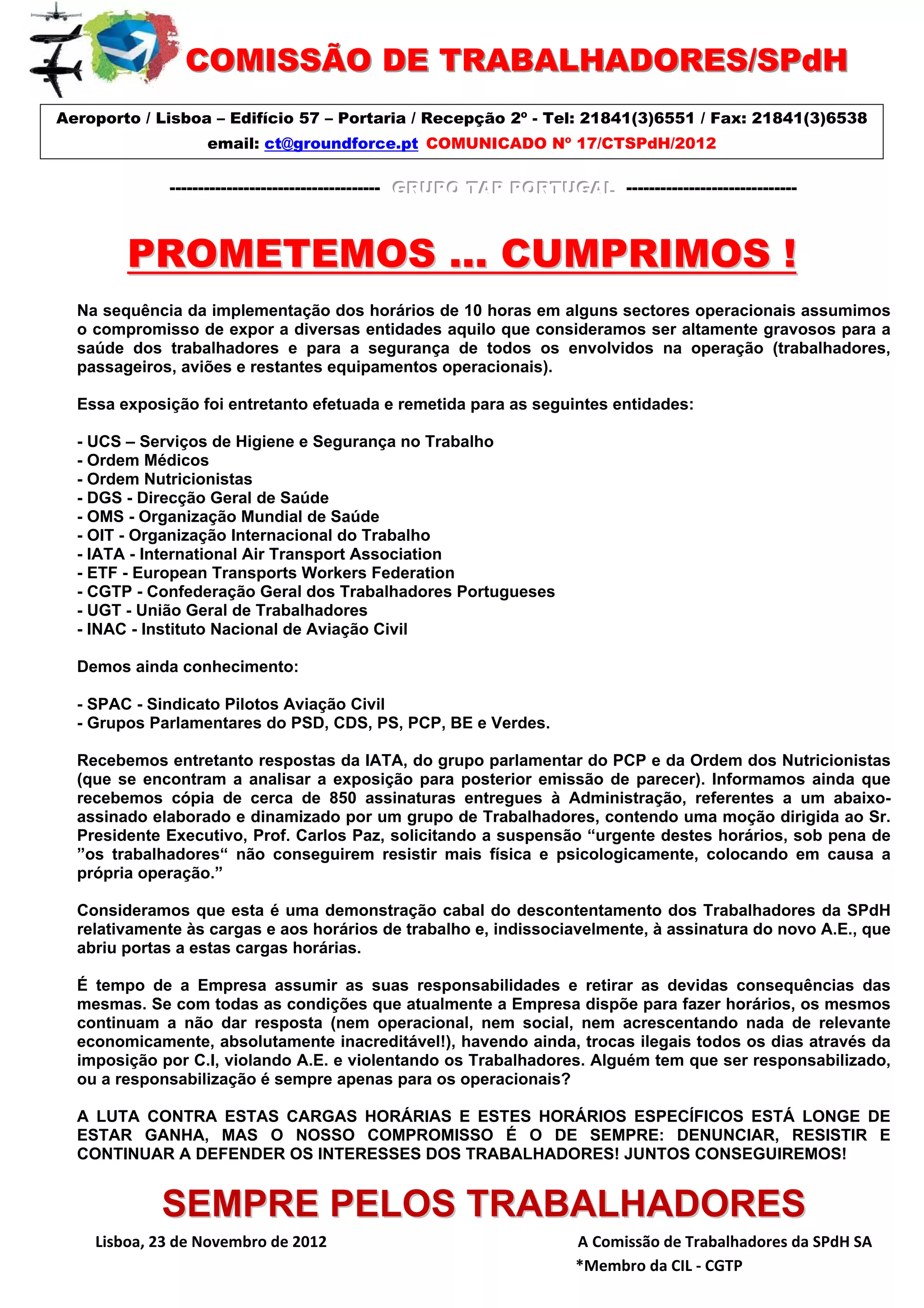 (1) A Comissão de Trabalhadores da SPdH enviou uma exposição sobre os horários de 10 horas para várias entidades de saúde e direitos trabalhistas; (2) Receberam respostas iniciais da IATA, PCP e Ordem dos Nutricionistas e um abaixo-assinado de 850 trabalhadores pedindo a suspensão dos horários; (3) A Comissão continuará a lutar contra estas cargas horárias e horários específicos para defender os interesses dos trabalhadores.