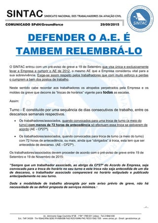 Este documento discute uma greve planejada pelo SINTAC contra a TAP por violações do acordo de emprego de 2012. Ele explica que os trabalhadores só devem trocar turnos com 72 horas de antecedência ou se concordarem, e que devem seguir as instruções da greve de 19 de setembro a 19 de novembro de 2015.