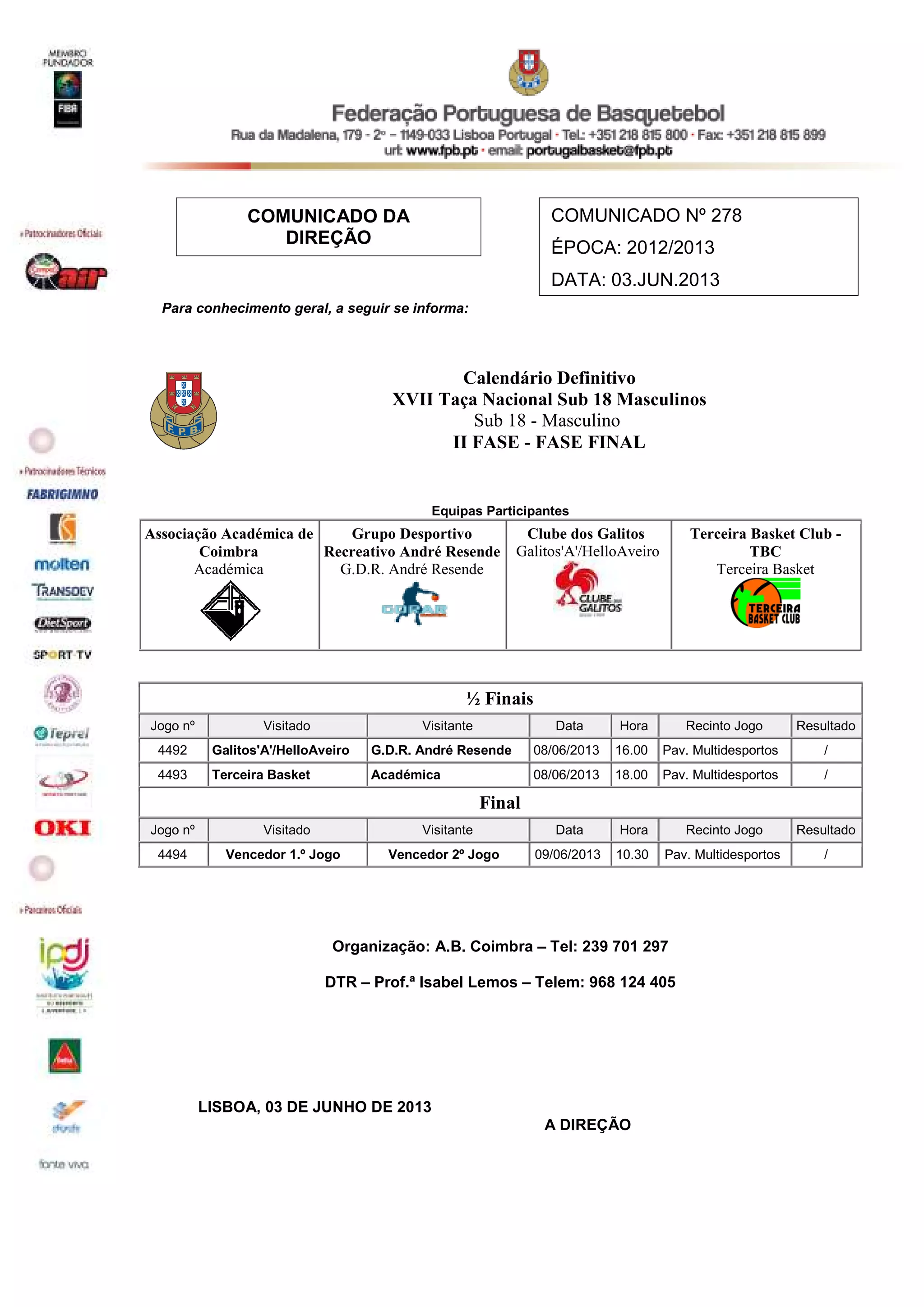 O documento descreve o calendário da XVII Taça Nacional Sub 18 Masculinos, incluindo as datas e locais das meias-finais entre Galitos'A'/HelloAveiro vs G.D.R. André Resende e Terceira Basket vs Académica em 8 de junho, e da final entre os vencedores em 9 de junho no Pav. Multidesportos.