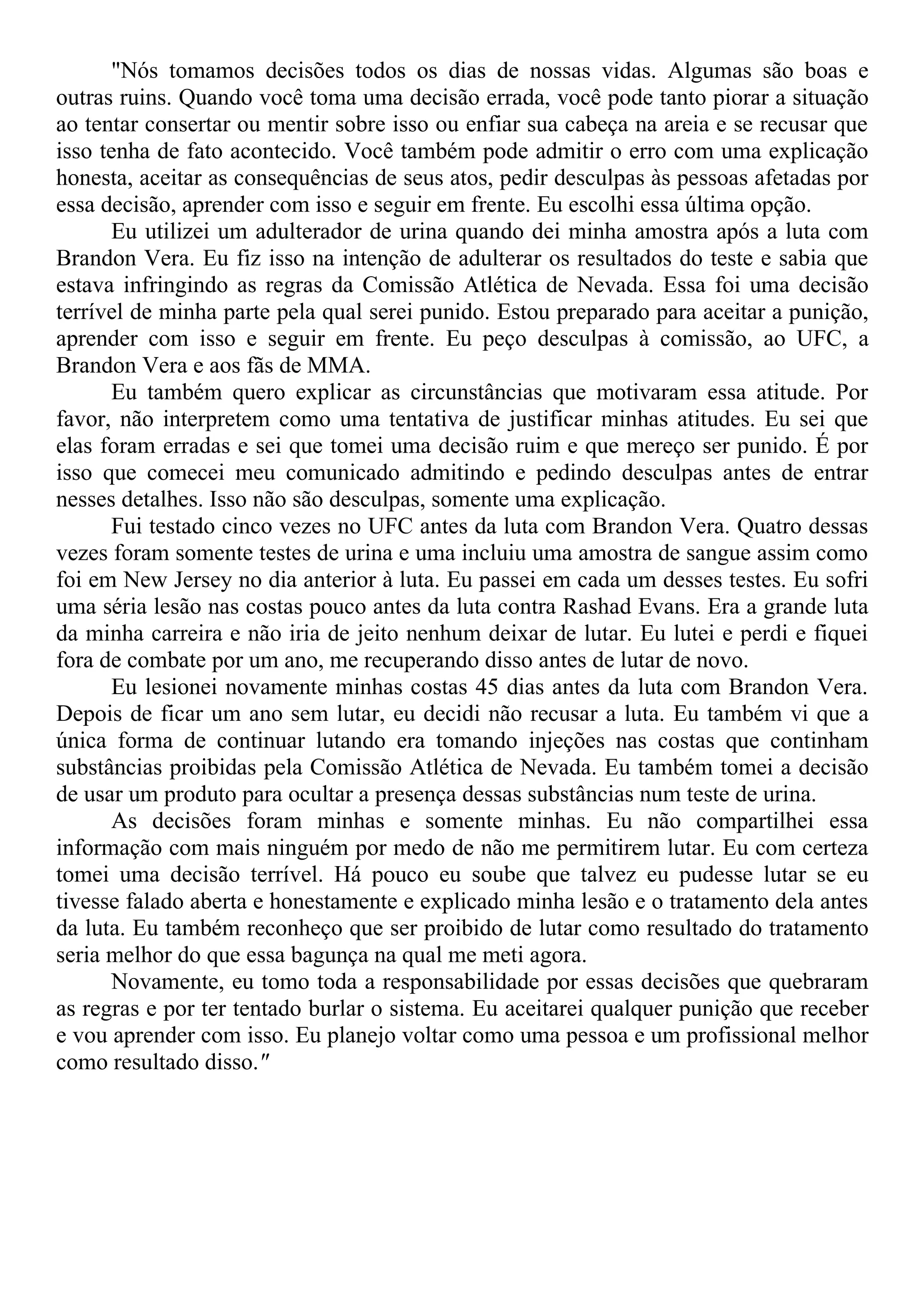 2) Ele sofreu uma lesão nas costas 45 dias antes da luta e tomou injeções contendo substâncias proibidas para lutar, além de usar o adulterador de urina.