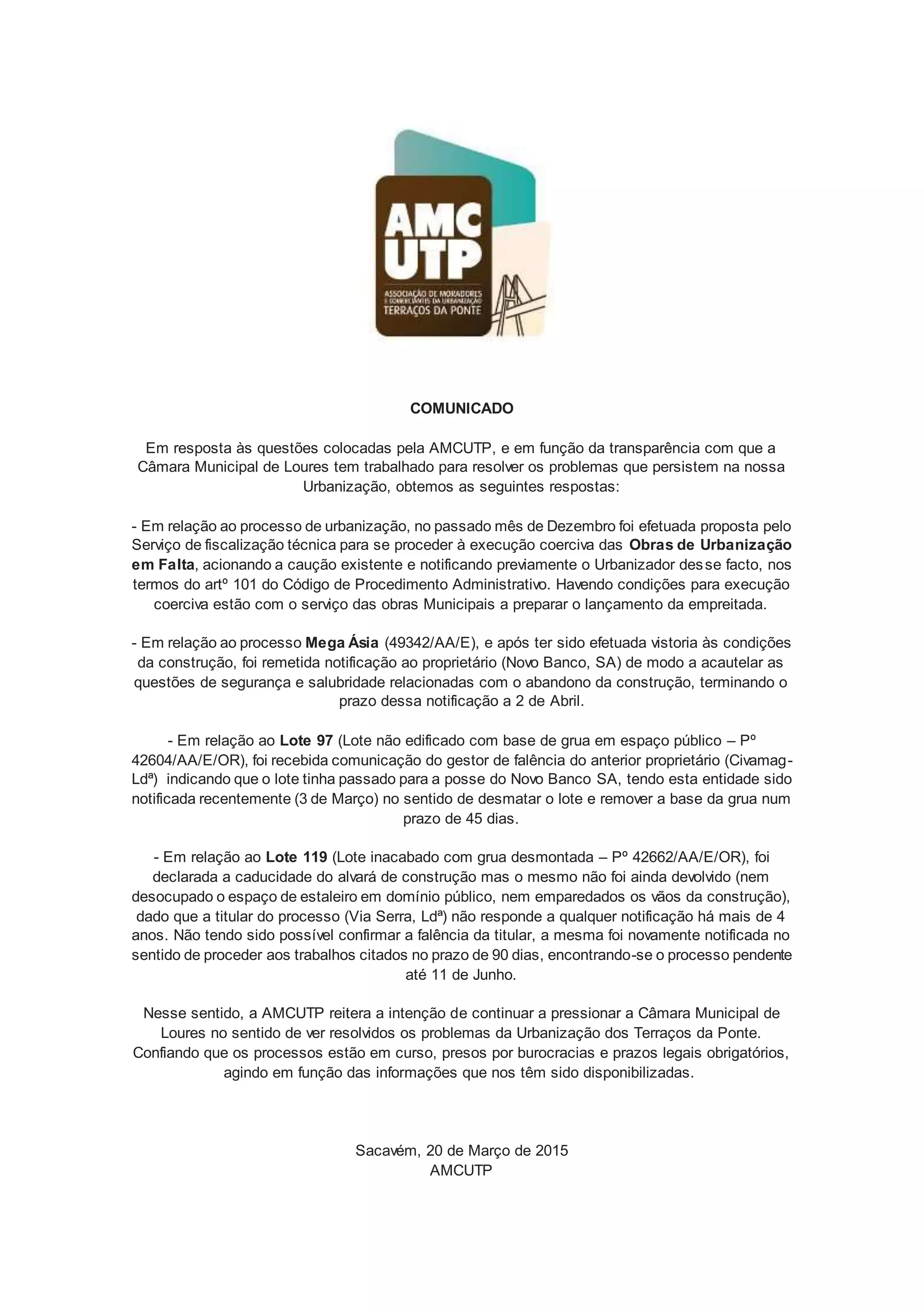 A Câmara Municipal de Loures respondeu às questões da AMCUTP sobre a urbanização dos Terraços da Ponte. As obras de urbanização em falta serão executadas coercivamente e o Mega Ásia e dois lotes problemáticos foram notificados. A AMCUTP continuará a pressionar a Câmara para resolver os problemas da urbanização.