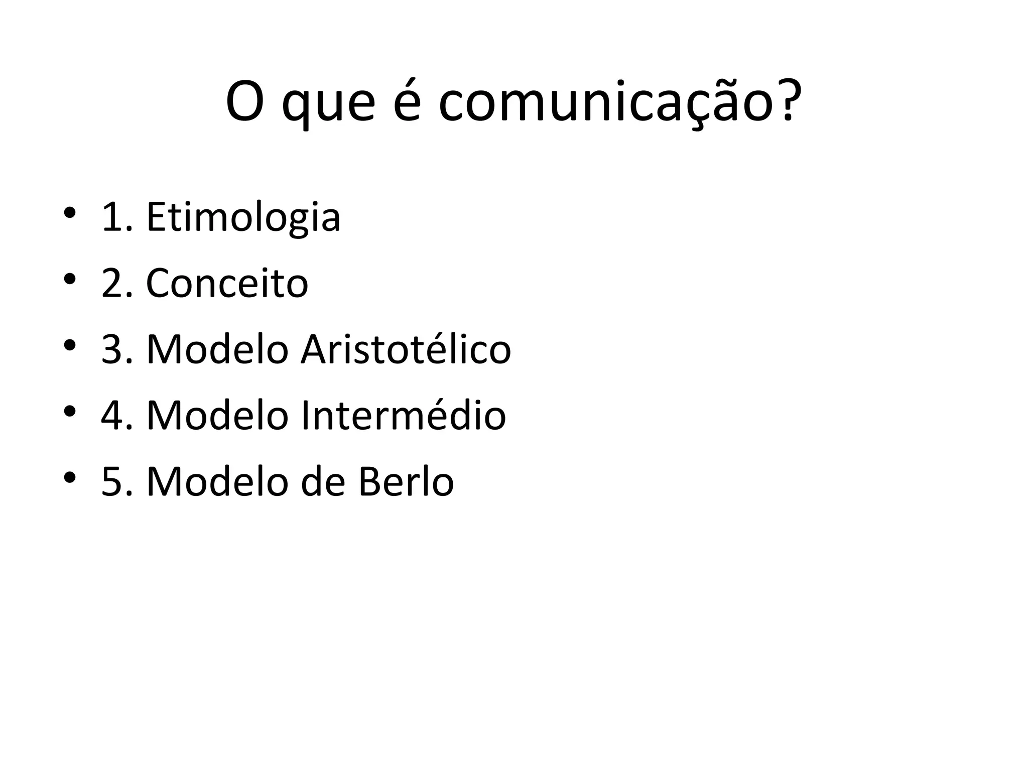O documento discute o conceito de comunicação, definindo-a como o processo de compartilhar mensagens, ideias, sentimentos e emoções entre pessoas. Apresenta três modelos de comunicação: o modelo Aristotélico que descreve a intenção, mensagem, canal e reação; o modelo intermédio que acrescenta habilidades de comunicação; e o modelo de Berlo que inclui também conhecimento e posição sociocultural.