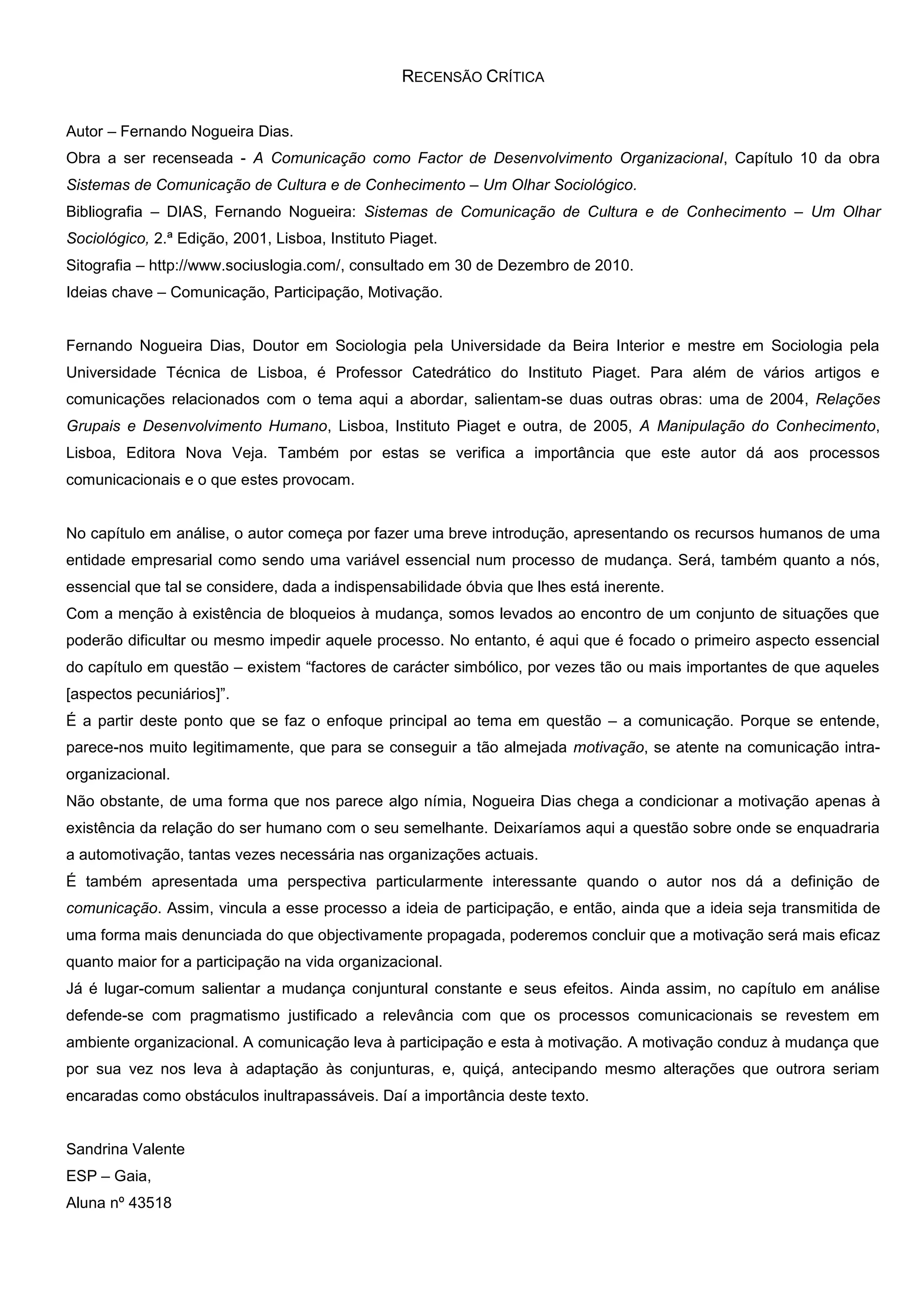 O capítulo analisa como a comunicação pode ser um fator de desenvolvimento organizacional. Defende que a motivação dos funcionários, essencial durante a mudança, depende da comunicação interna na organização. Explica que a comunicação envolve participação, o que por sua vez aumenta a motivação dos funcionários e facilita o processo de mudança e adaptação às novas conjunturas.