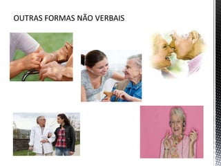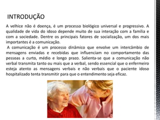 O documento discute a demência senil e formas de comunicação com idosos com demência. Apresenta teorias sobre a doença de Alzheimer e estratégias de comunicação para enfermeiros, como falar devagar, dar tempo para resposta e personalizar cuidados para estabelecer confiança.