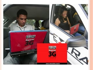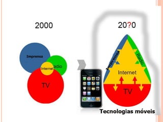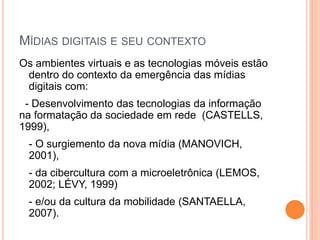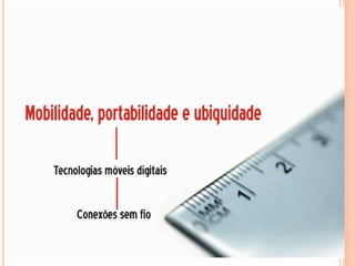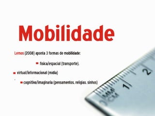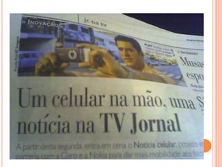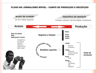 O documento discute a dependência do jornalismo em relação à tecnologia e como ambientes virtuais e tecnologias móveis impactam a produção jornalística. Ele explora como a mobilidade e cultura digital transformaram a sociedade em rede e como o jornalismo móvel permite novas formas de produzir notícias para várias plataformas.