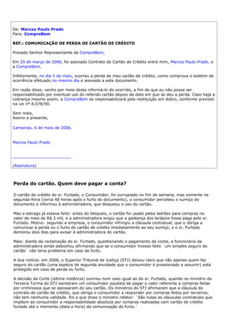 O documento relata que o sr. Furtado teve seu cartão de crédito furtado no fim de semana e comunicou a administradora do cartão 48 horas depois. A administradora cobrou as compras feitas pelos ladrões, alegando que o sr. Furtado não comunicou imediatamente a perda. No entanto, o STJ decidiu que o consumidor não é responsável por compras feitas por terceiros após o furto, mesmo que informe a administradora após 72 horas.