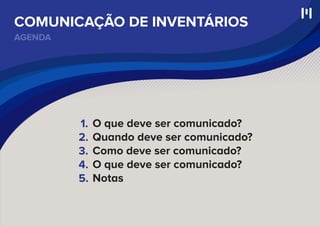 O documento trata das regras para a comunicação de inventários às autoridades fiscais, especificando o que, quando e como deve ser comunicado. As empresas devem enviar a comunicação até 31 de janeiro do ano subsequente ou até o final do primeiro mês do período, utilizando arquivos em formato texto ou XML. Estão dispensadas empresas com volume de negócios inferior a 100.000€ e não são permitidas comunicações parciais de inventário.